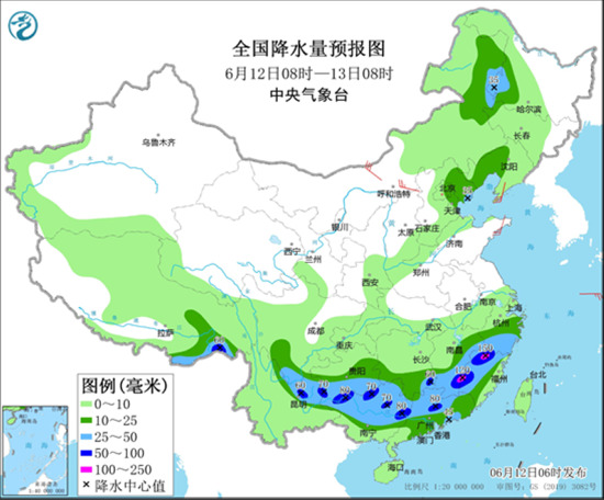中国天气网讯 未来三天(6月12日至14日),江南、华南新一轮强降雨天气过程发展,强降雨集中在湖南南部、江西、浙江南部、福建、广西、广东、云南、贵州等地,雨区与前期重叠,要警惕次生灾害的发生。同时,华北、东北等地多阵雨或雷阵雨,并伴有强对流天气,需注意防范。