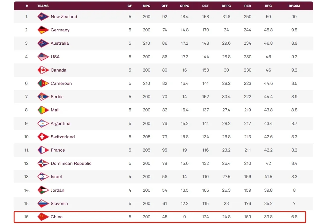 最终,中国U19男篮以76-85不敌法国队,本届赛事五战皆墨,难求一胜。五场比赛下来,中国U19男篮一共让对手抢到了106个进攻篮板(法国26个、新西兰18个、斯洛文尼亚17个、德国18个、加拿大27个)。而截至目前,中国队的篮板球总数仅为169个,在本届赛事的篮板球数据统计中暂时排名倒数第一。
