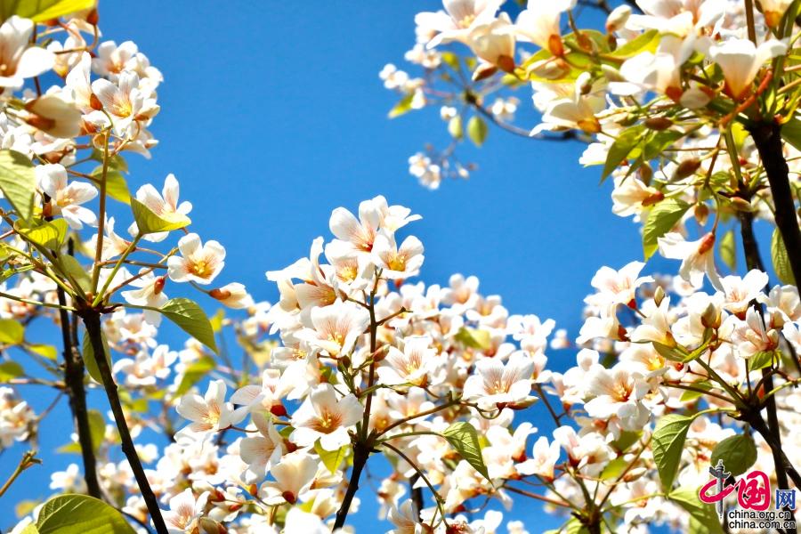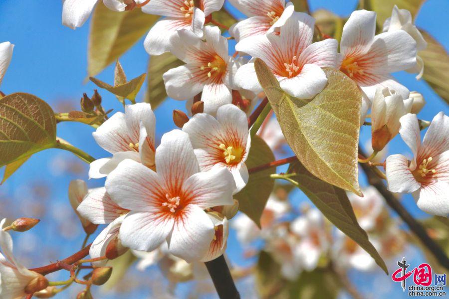 据了解,油桐的花期较短,仅半个月左右。每年四月中旬,便能看到密集成林的油桐白花簇簇,整个山头全是花朵的世界。随着阵阵清风,空中飘起雪白的花雨,蓝天白云,落英缤纷,清香馥郁,飘逸山外。