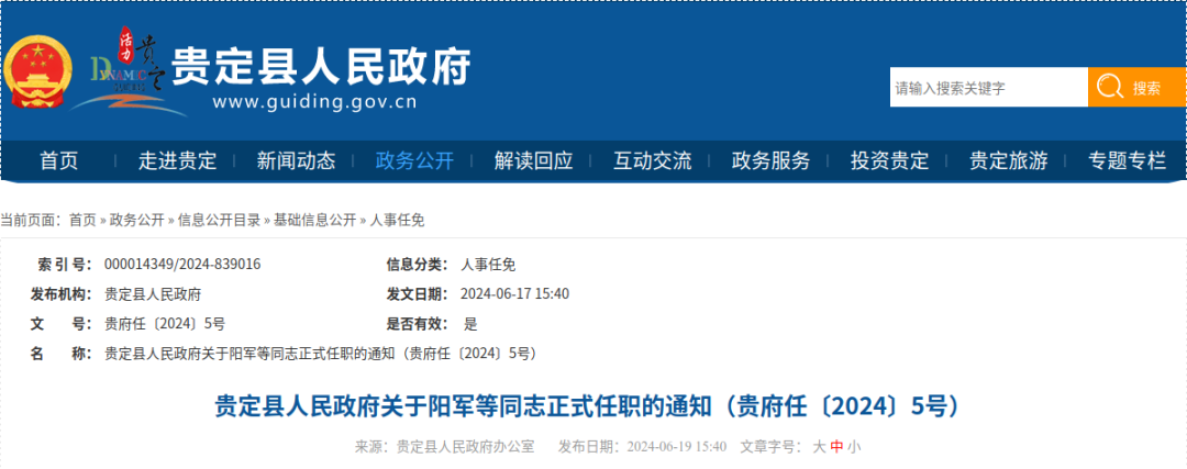 贵定县人民政府关于阳军等同志正式任职的通知