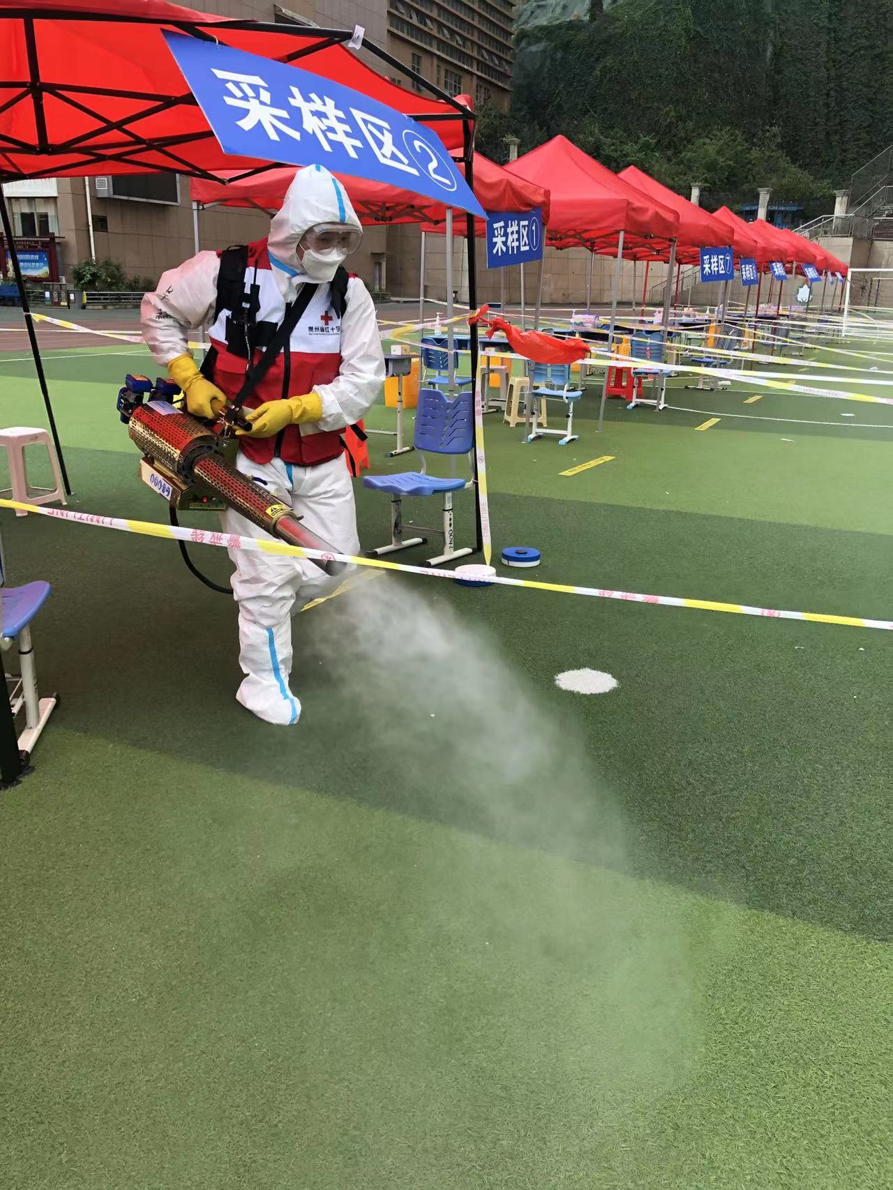 9月5日,救援队出动13台车辆、41名队员220余人次,完成救援队营地3顶37平方米帐篷搭建、花果园社区9个高风险地区、9个低风险地区近40万平方米区域环境消杀、核酸检测秩序维护、花果园一期密集接触者转运过程中的环境消杀和秩序维护等工作。晚上11时30分接贵阳市云岩区毓秀街道办事处请求,紧急赶到黔灵西路对美盈农贸市场进行环境消杀。