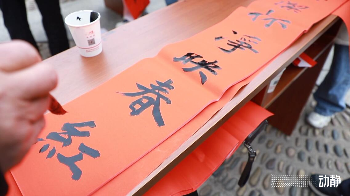 另一边,书法爱好者们在春联纸上奋笔疾书,字里行间流淌着温馨和美好,充满着迎新春的喜气景象,现场群众还可以自主免费挑选心仪的春联带回家。
