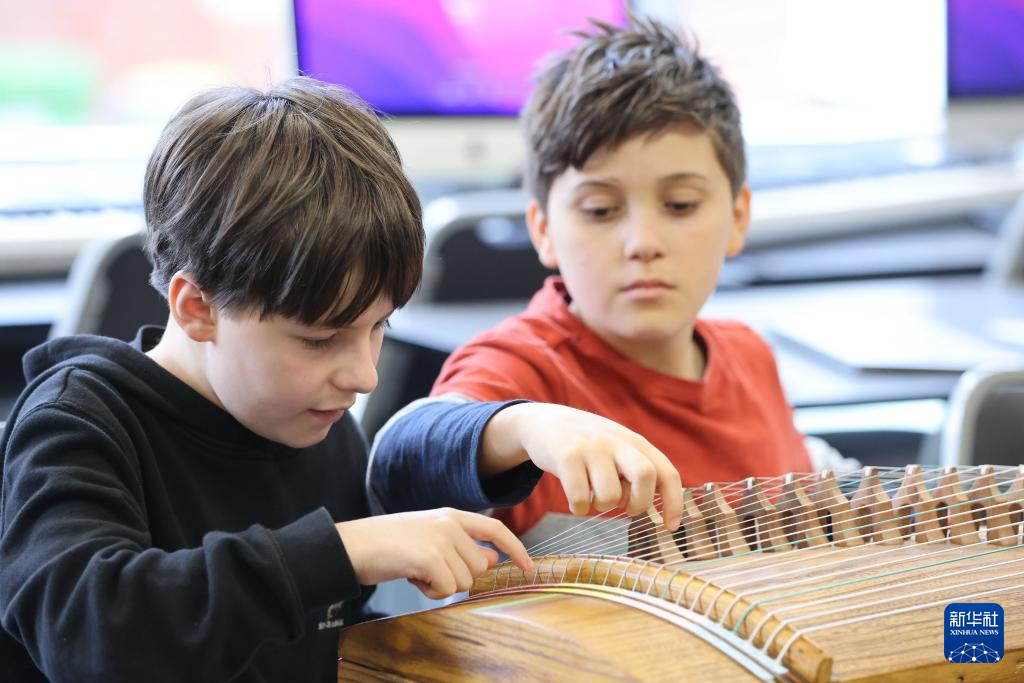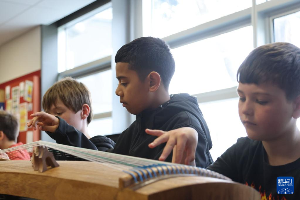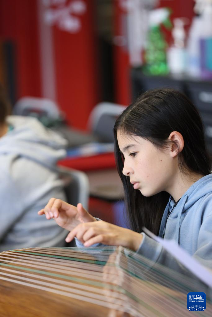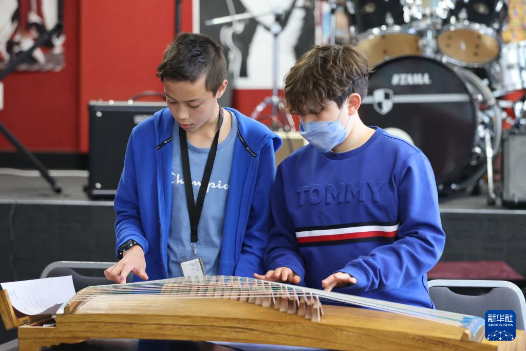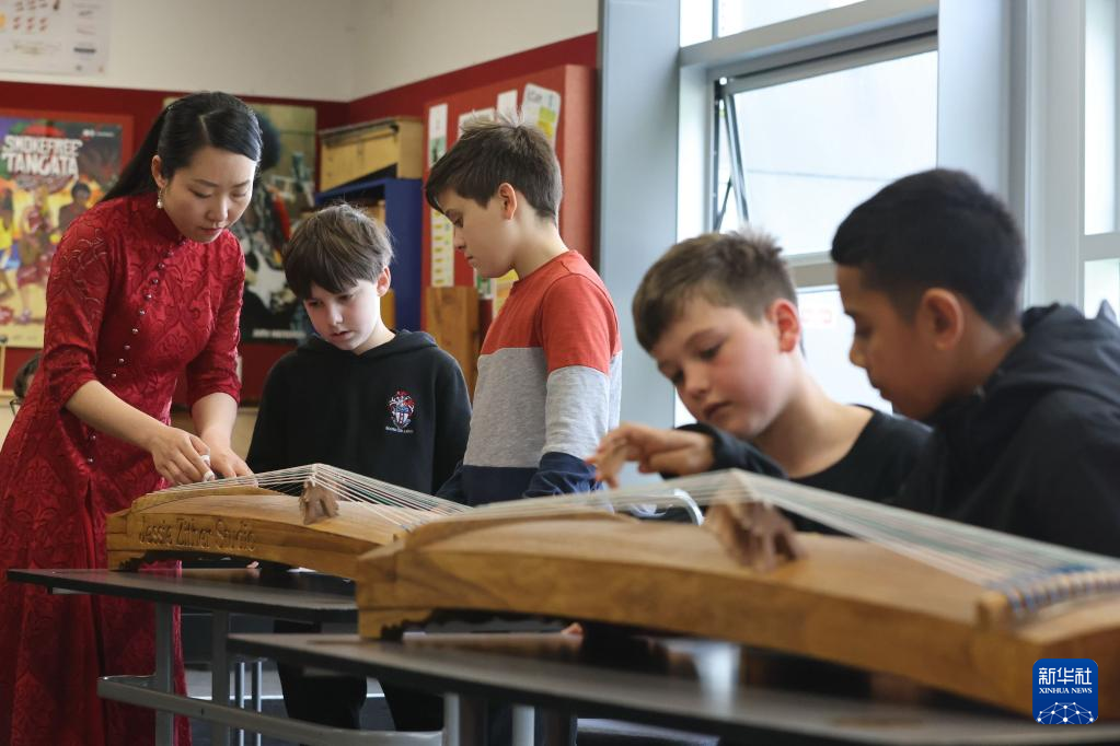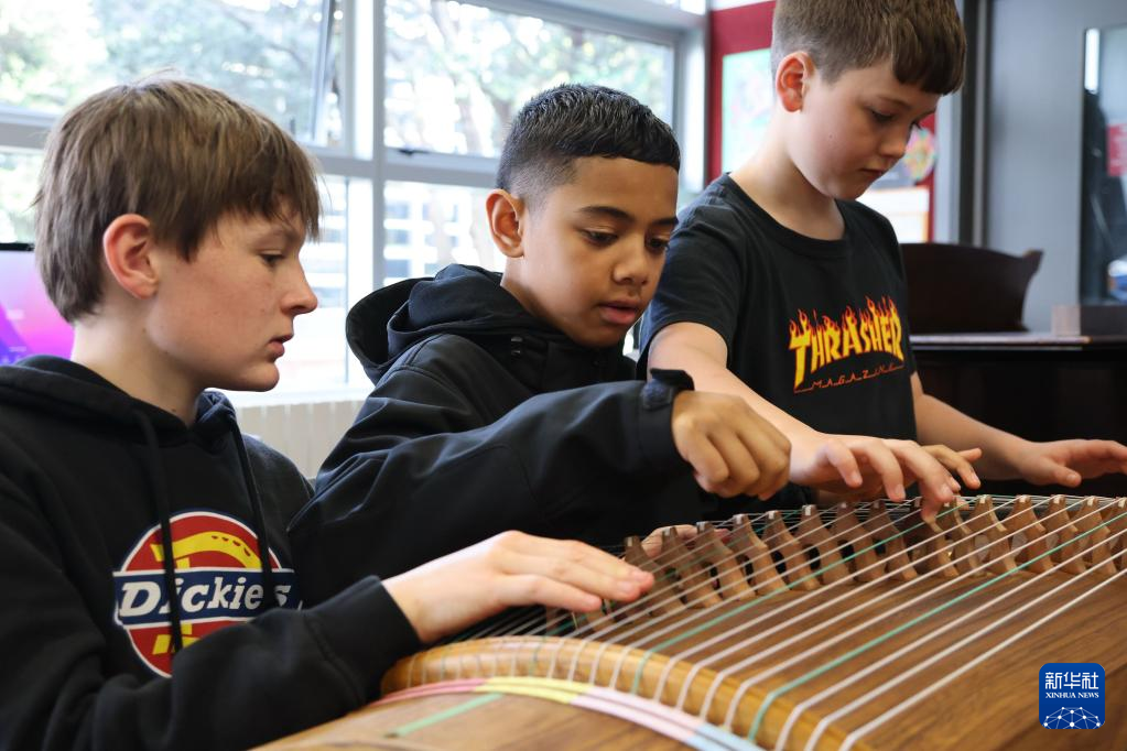 在新西兰首都惠灵顿,斯科特中学七年级学生体验古筝弹奏。新华社发(孟韬摄)