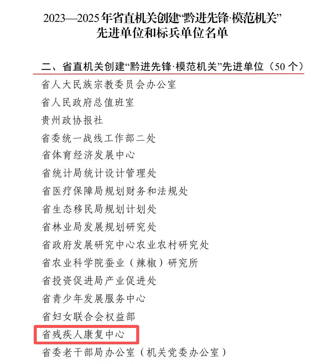这一年,贵州省残疾人康复中心获评省直机关“黔进先锋·模范机关”先进单位,并成功申报学前教育资质,创新采用“医康教结合”办学模式创办苔花幼儿园,为残疾儿童提供优质学前教育资源。康复服务能力持续升级,贵州省康复医院创新开展SPR脑瘫等新手术项目,率先引进“海扶刀”高端微创手术设备,首创推出“一老一小”户外生态康复服务基地,获批多项厅局级科研课题。