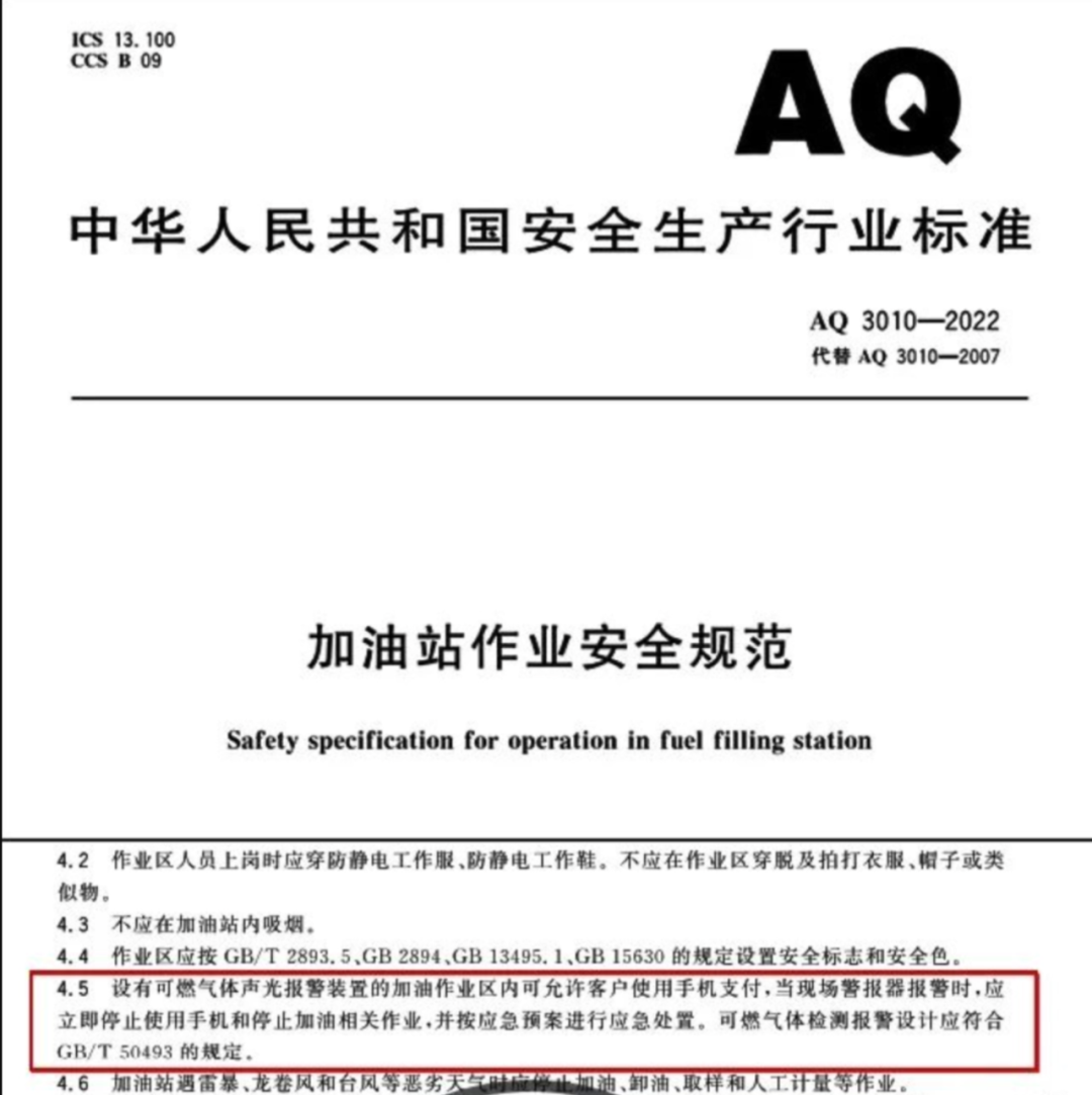 今年4月1日,由应急管理部批准的新《加油站作业安全规范》(AQ3010-2022)将代替AQ3010-2007并正式实施。相较于传统内容,新规范结合了手机支付广泛普及的时代特点,允许在设置可燃气体声光报警装置的情况下进行手机支付。这也意味着,加油站的安全需求正在与时俱进。