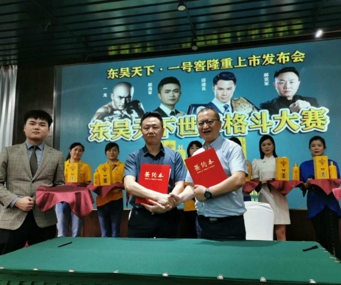 发布会上,贵州遵义酱香时代酒业有限公司董事长韩春阳与宇洲传媒(广东)有限公司董事长郝亚军签订了战略合作协议,东吴天下1号窖酒运营方除了通过体育竞技赛事进行推广外,还将在全国各省市招募代理商,面向全国销售。