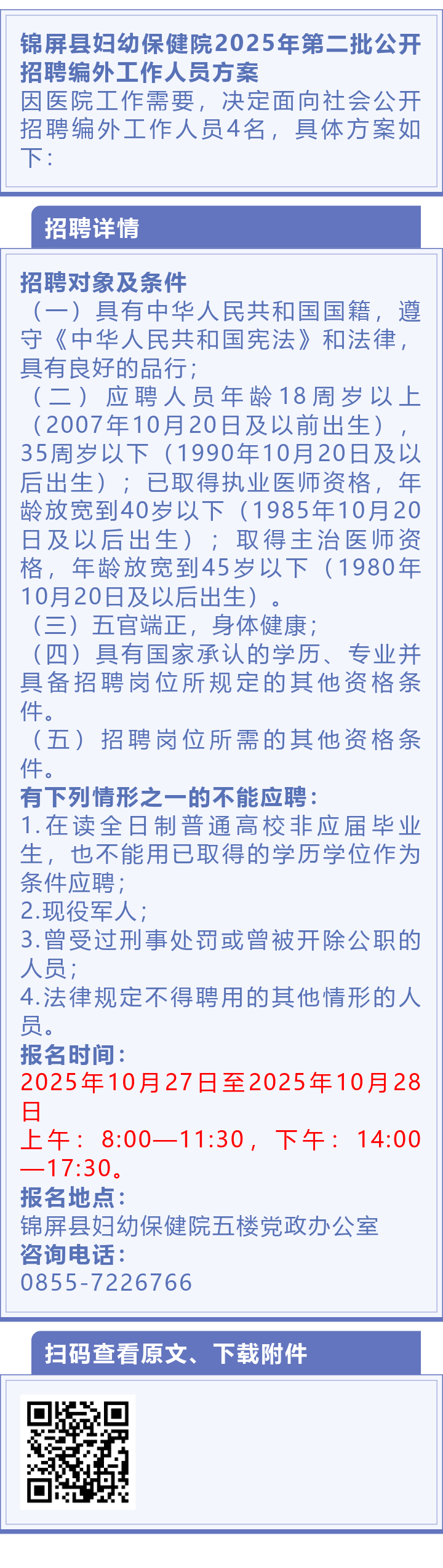 【事业单位】锦屏县妇幼保健院招聘!报名时间:2025年10月27日至10月28日!
