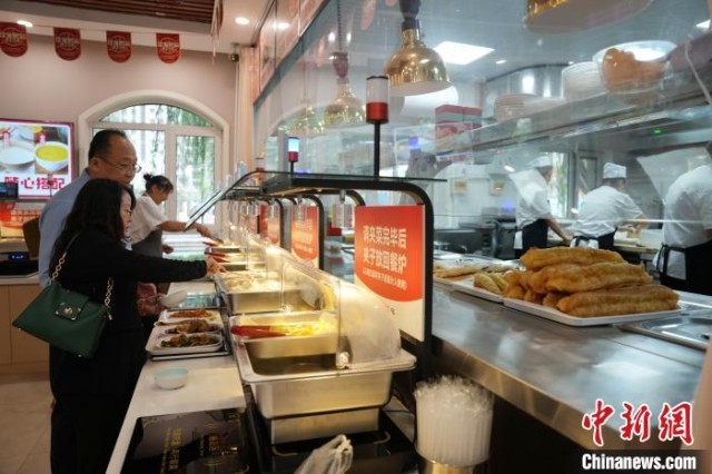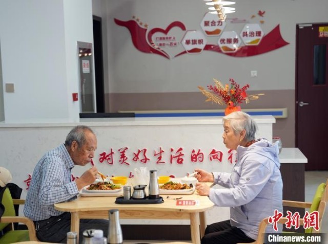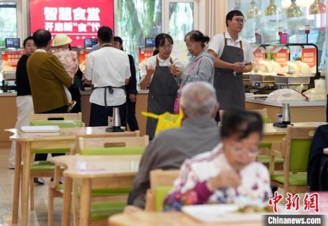 9月11日,两位年近八旬的老人在智慧食堂享用午餐,他们满意地说这就是他们心目中理想的饭菜。中新社记者 毛建军 摄