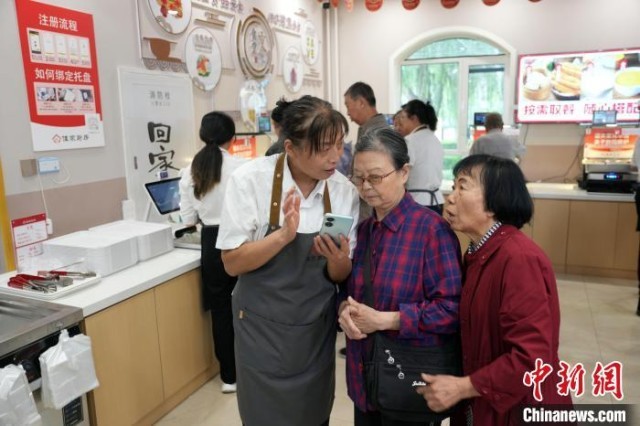 9月11日,甘肃省兰州市西固区西固城街道“智慧食堂”服务人员帮助老年人在手机上绑定信息。中新社记者 毛建军 摄