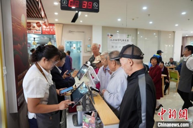 9月11日,老年人在位于甘肃省兰州市西固区西固城街道的“智慧食堂”排队登记用餐。中新社记者 毛建军 摄