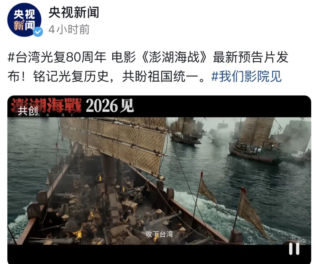 从2021年8月立项到2025年1月官宣杀青,《澎湖海战》即将于2026年与观众见面。影片不仅以震撼视效重现历史荣光,更昭示统一是历史大势、民心所向,势不可挡。当银幕上的战船驶向归航之路,现实中的两岸同胞也正循着历史足迹,共赴同心统一的光明前程。