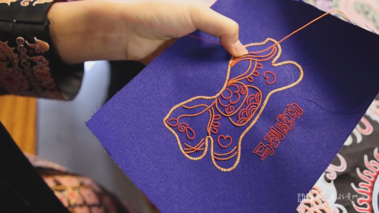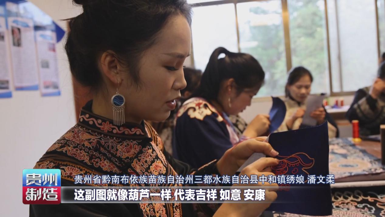 贵州省黔南布依族苗族自治州三都水族自治县中和镇绣娘潘文柔告诉记者,她现在正根据图案设计要求来绣这幅产品,这副图就像葫芦一样,代表吉祥、如意、安康,整幅图叫“马到成功”。