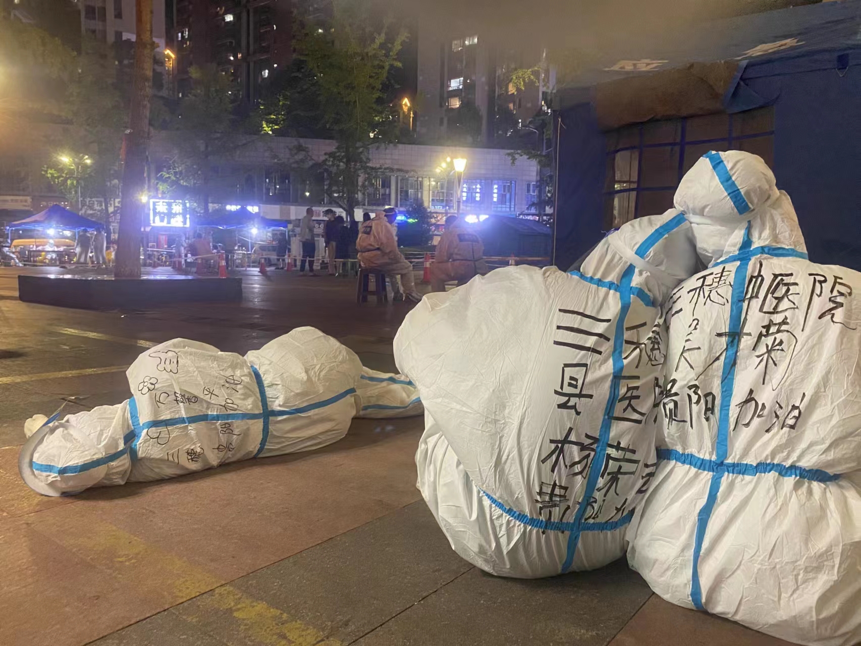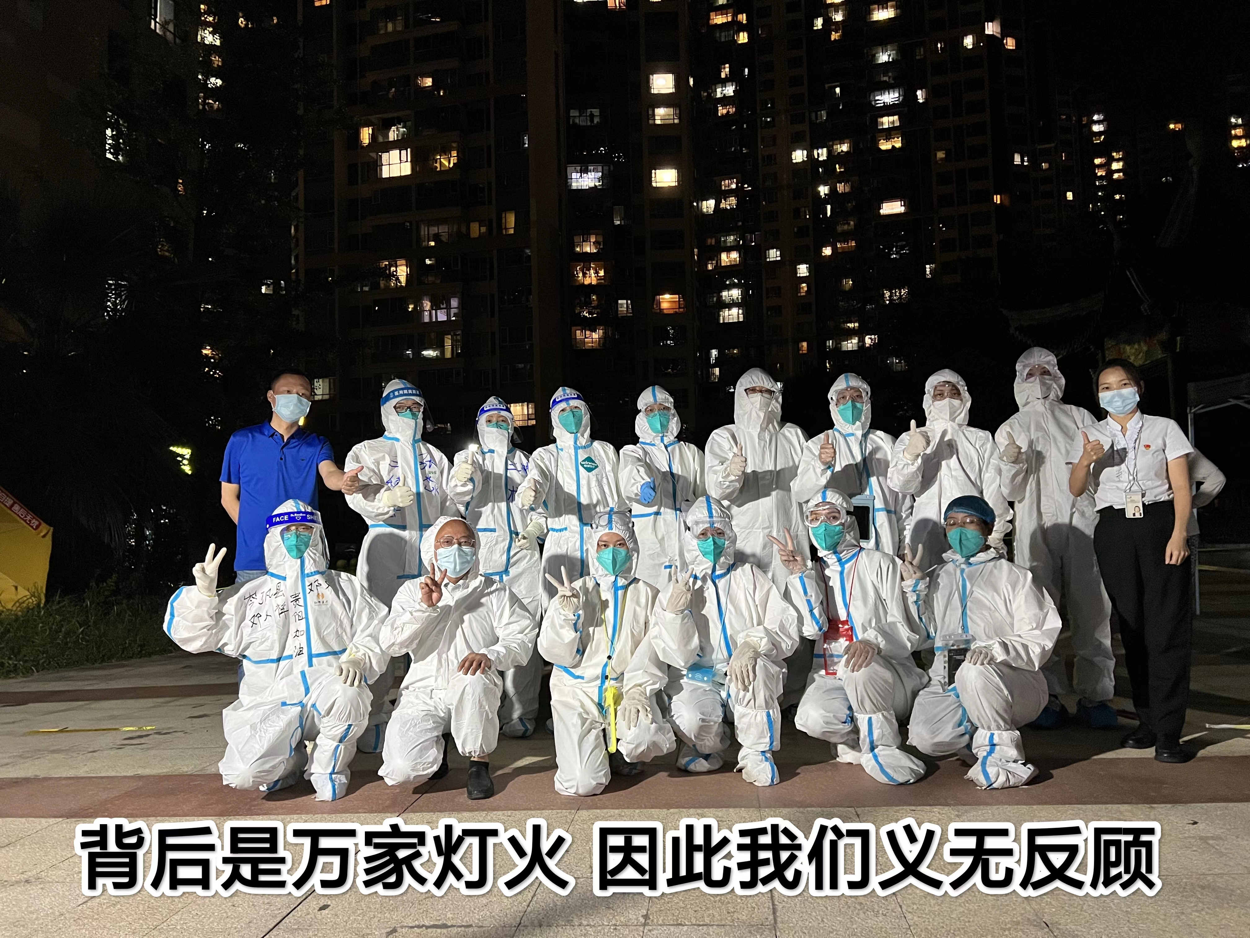 一群“大白”背对镜头,在夜幕中面向未来方舟的万家灯火一起比心。昨天,这张照片感动了万千网友。