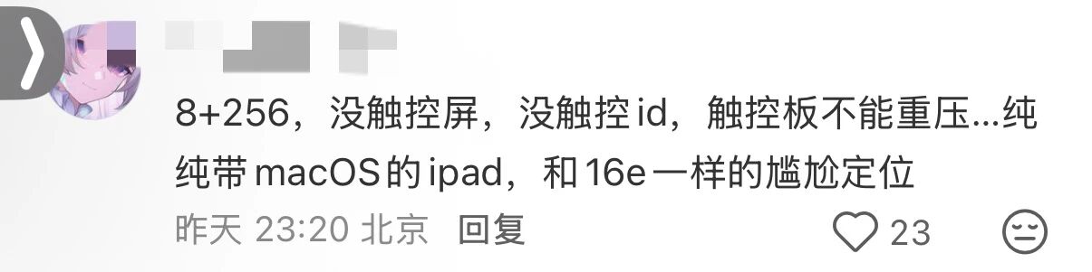 3999元买一个苹果笔记本是不是很划算?很快有网友发现,这款被命名为Neo的笔记本使用的是A18 Pro芯片,这款芯片原来被使用于iphone16 pro,而此前苹果最为大众熟悉的笔记本air,搭载的则是M4芯片(已更新成M5),因此,不少数码爱好者调侃称,Neo的出现简直是苹果为了清理上一代手机芯片的库存。再加上Neo没有键盘背光,没有触摸板力度控制功能,屏幕为12英寸,“这不就是ipad加了一个妙控键盘?”
