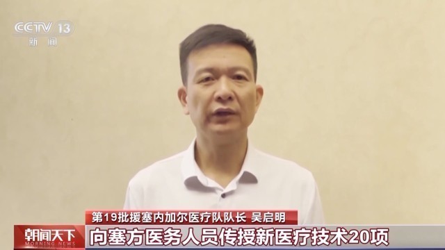 第19批援塞内加尔医疗队队长 吴启明:援塞两年来,我们以推进中非对口医院合作项目为契机,组织开展巡诊、义诊活动,向塞方医护人员传授新医疗技术20项,填补了多项技术空白,全体队员被塞内加尔政府授予国家雄狮勋章。接下来我们将把接力棒传递好,持续以仁心仁术造福当地人民,为增进中塞友谊作出新的贡献。