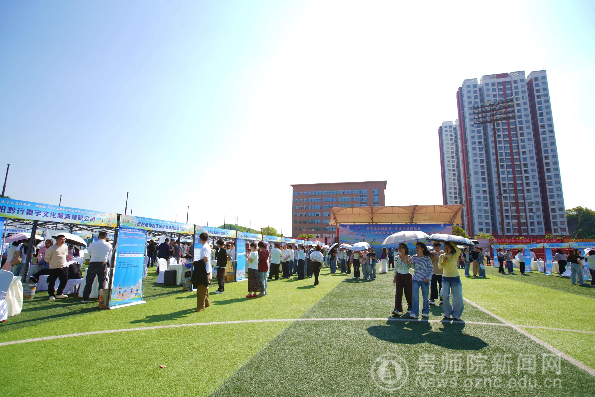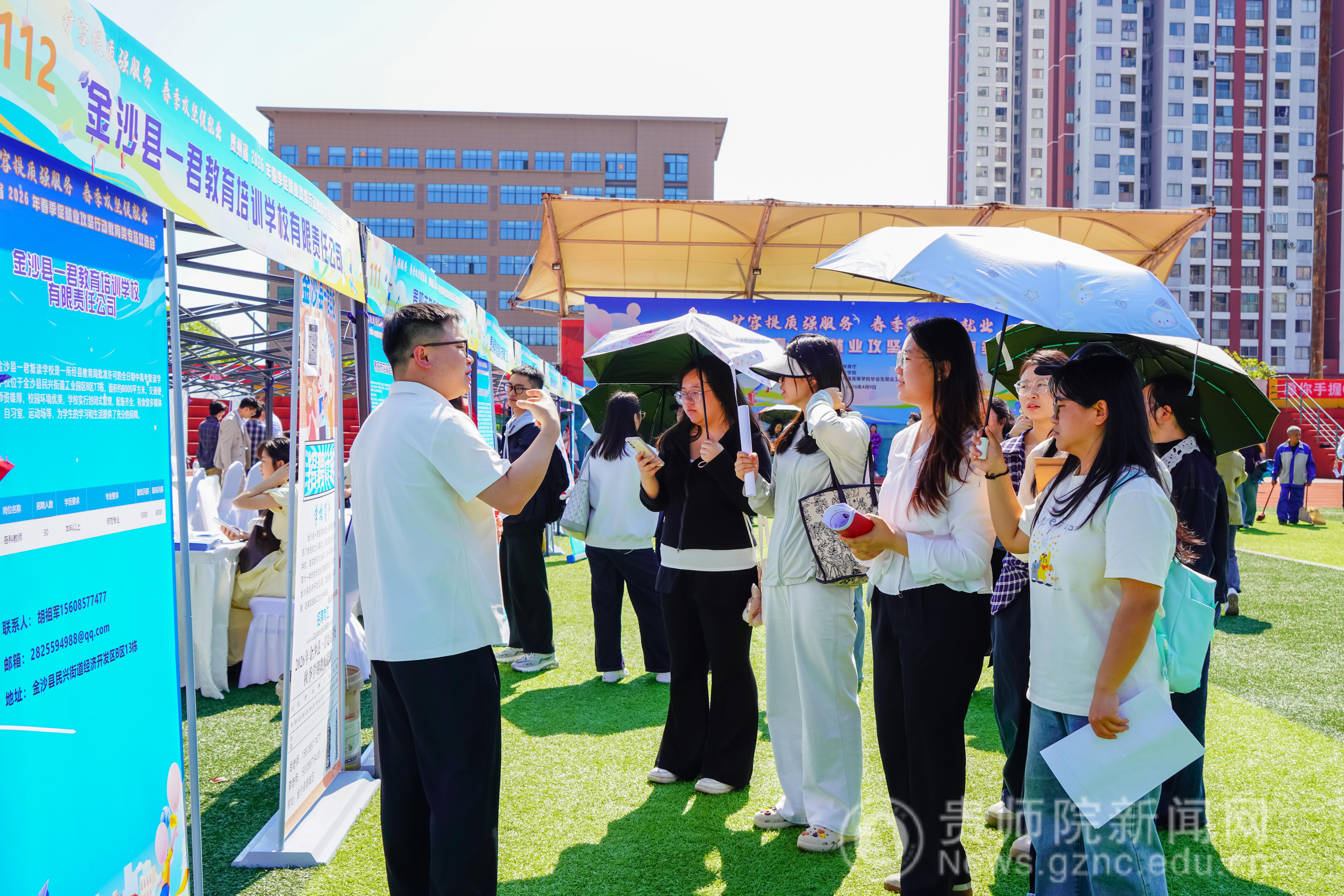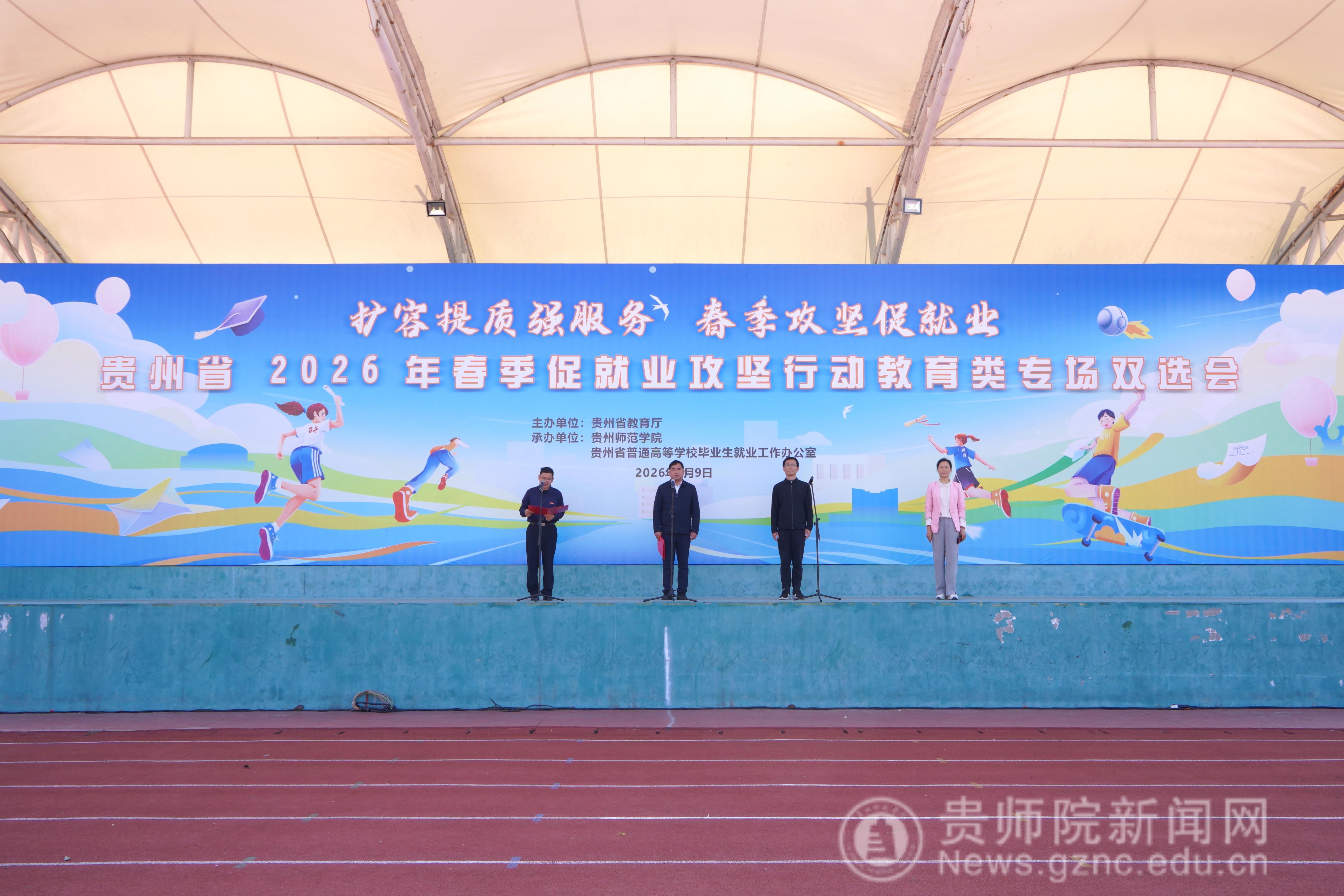 为深入学习贯彻党的二十大精神及习近平总书记关于教育的重要论述,全面落实党中央、国务院和省委、省政府关于高校毕业生就业工作的决策部署,扎实推进教育部2026届高校毕业生就业扩容提质行动,4月9日,由贵州省教育厅主办,贵州师范学院、贵州省普通高等学校毕业生就业工作办公室承办的“扩容提质强服务 春季攻坚促就业”———贵州省2026年春季促就业攻坚行动教育类专场双选会在贵州师范学院足球场举行。