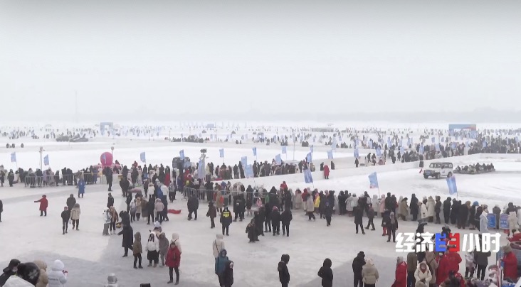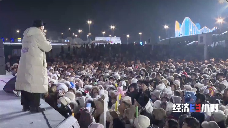 梦想大舞台前,近万名游客在主持人的带领下,随着音乐的节拍一起唱跳,在零下二十摄氏度的冰天雪地里体验别样的热情。