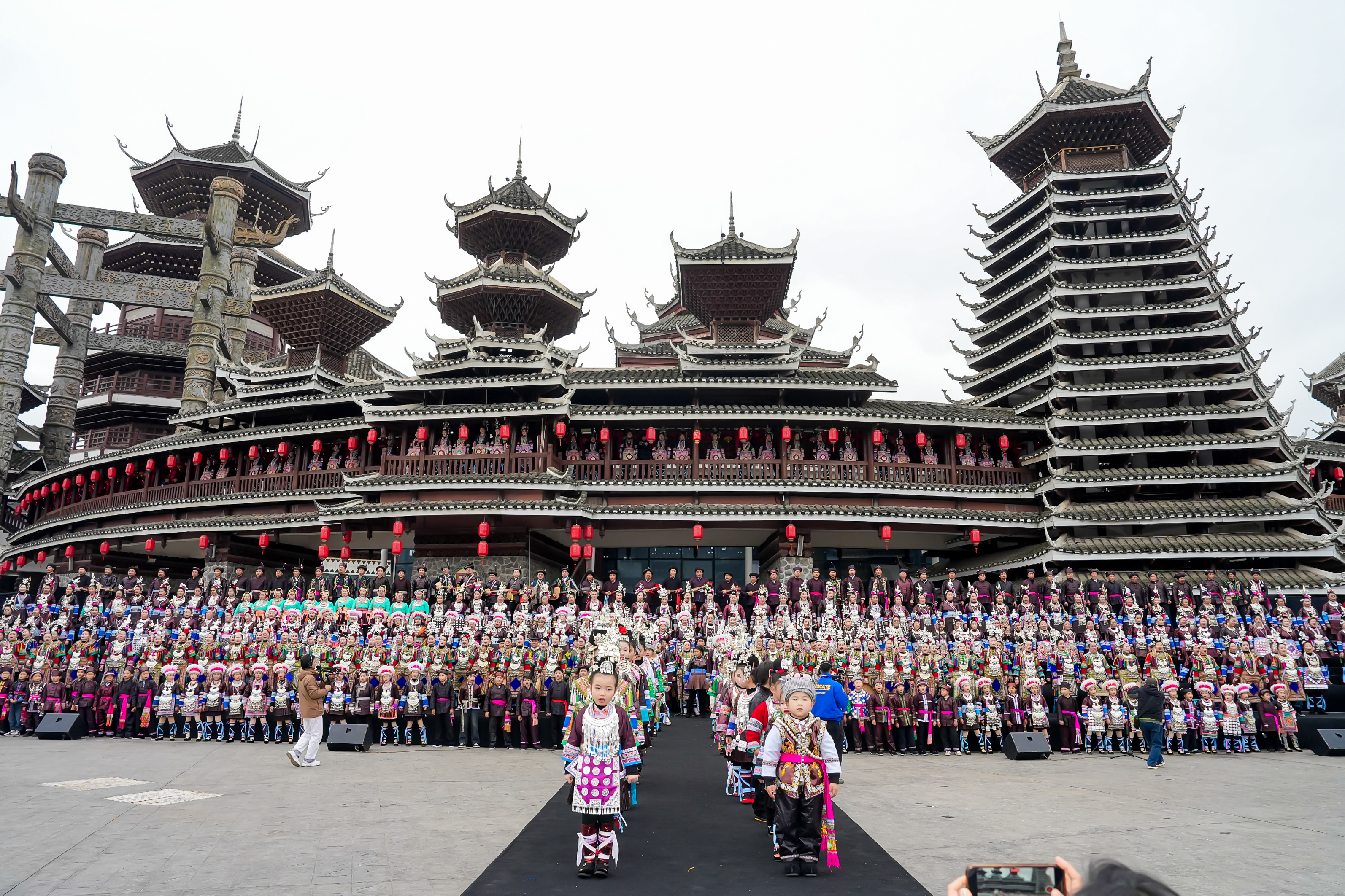 下午,鼓楼广场迎来系列活动中最震撼的表演之一。14时起,经过展演预热与侗芦笙演奏,由425人组成的侗族大歌合唱于16时准时开唱。《筑塘歌》《蝉之歌》《布谷催春》等经典曲目,以无伴奏、多声部的自然和声接连呈现,吸引大量游客驻足聆听。来自北京的摄影爱好者陈先生感叹:“以往只在电视上看过侗族大歌,现场四百余人合唱的震撼无法言传。我已经录下来,一定要让朋友们看看贵州的文化瑰宝。”