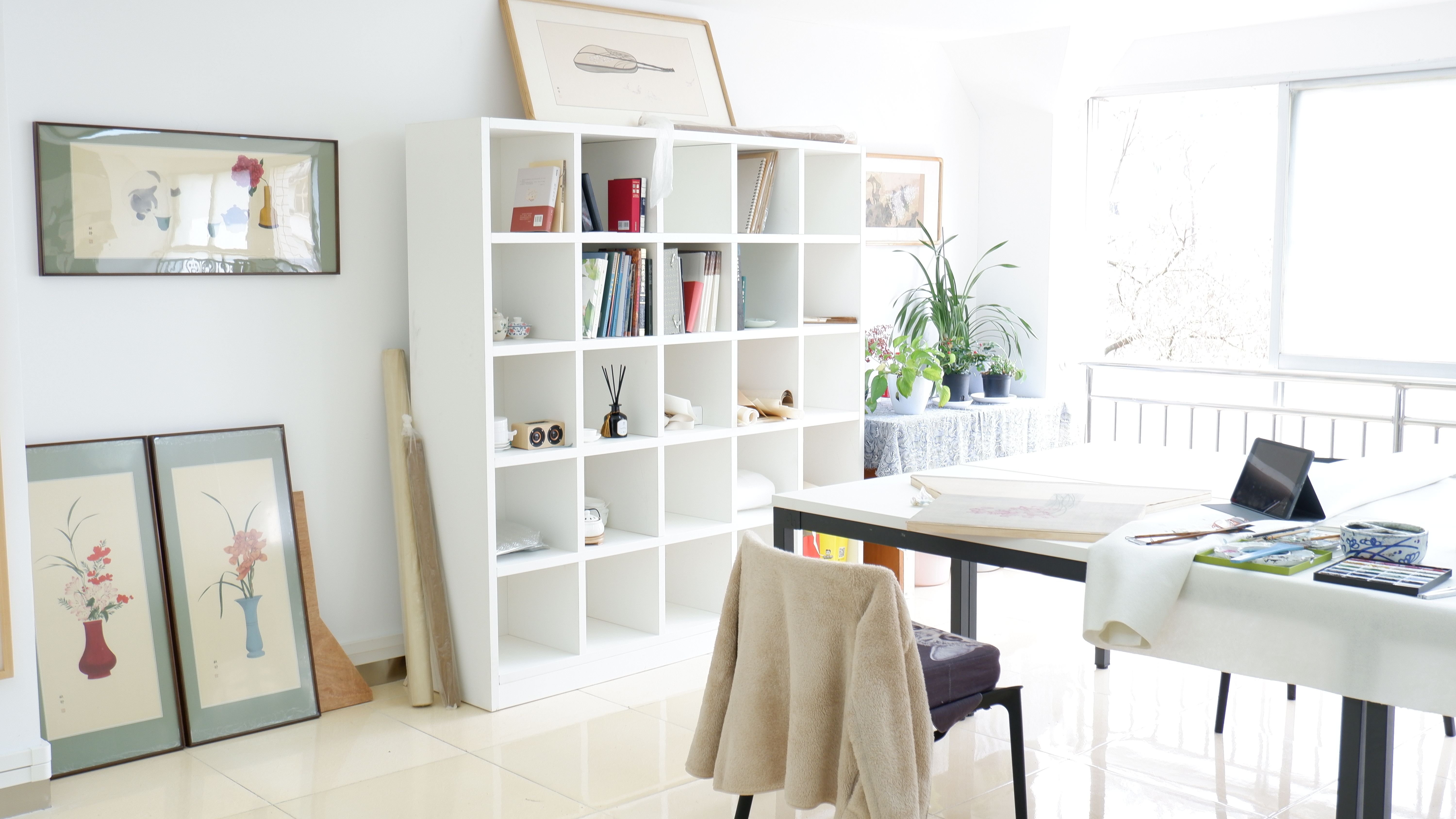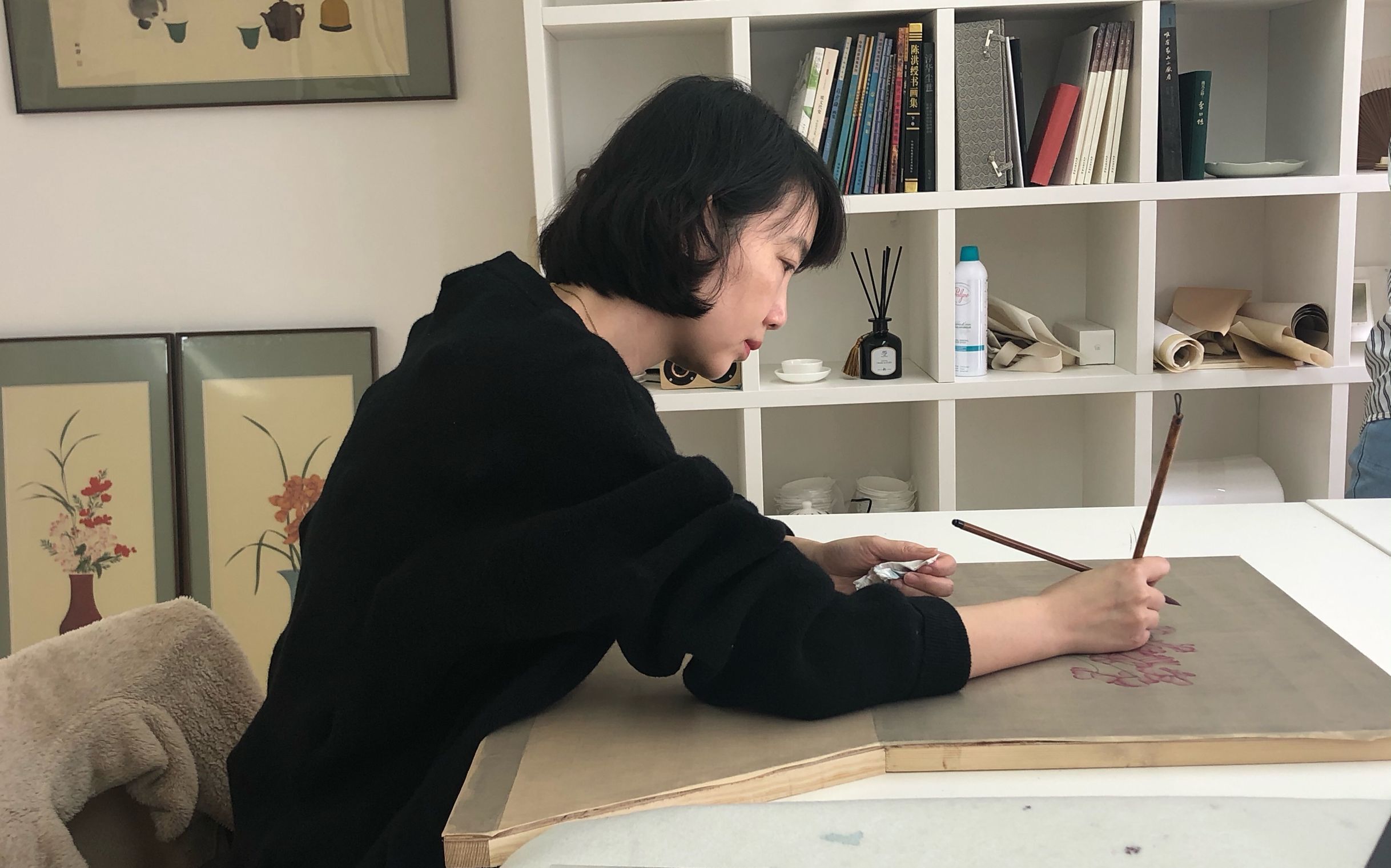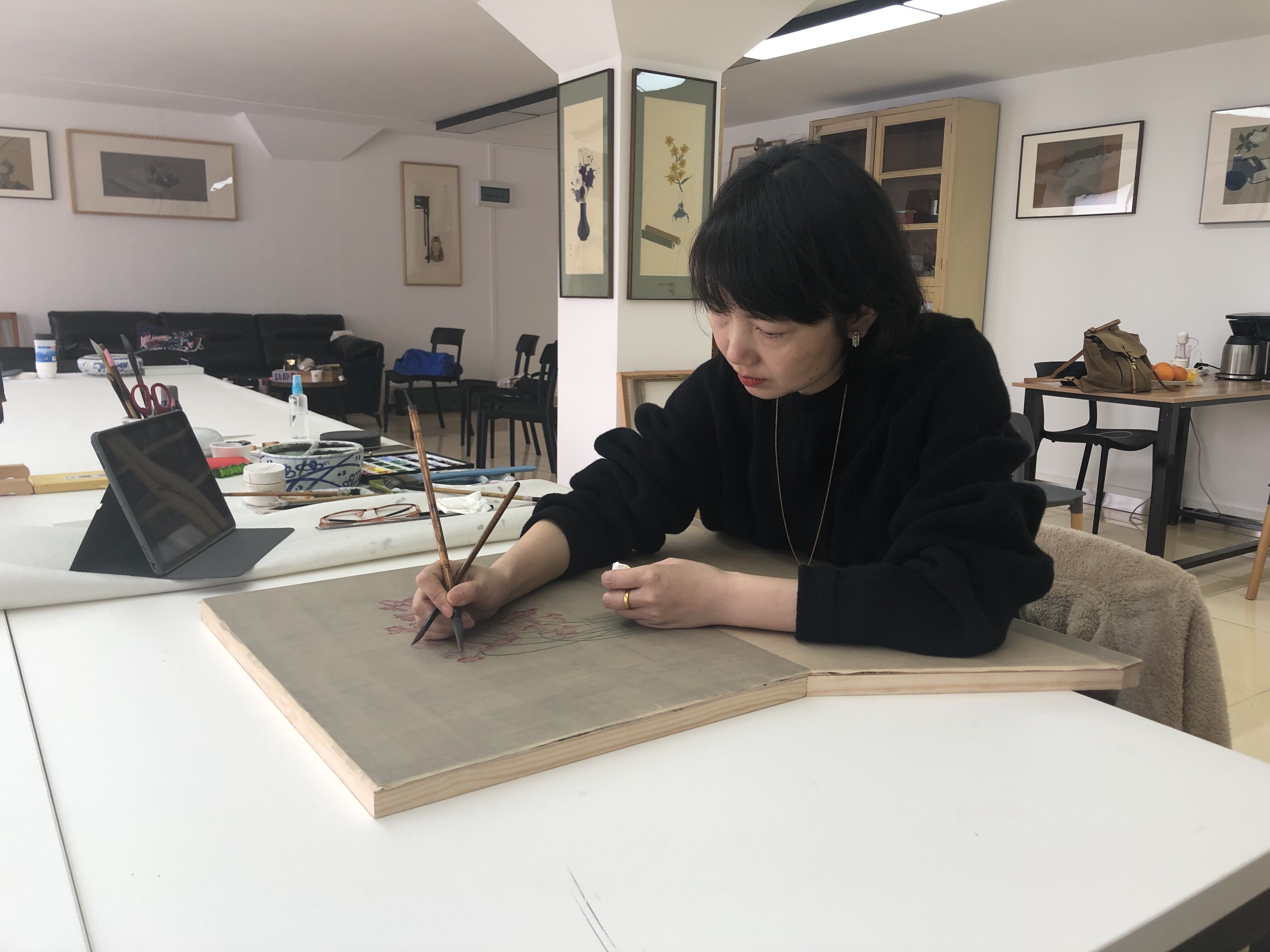 走进贵州师范大学当代视觉艺术研究中心顾静的绘画工作室,映入眼帘的是一幅幅装裱精致、温婉细腻、生动舒展的工笔画,它们有园林、庭院、器物、花卉......清墨淡彩间勾勒出几分闲情别致。