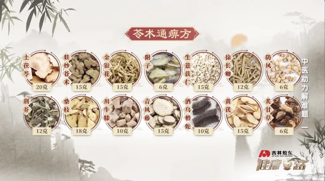适合在风湿缓解期内服,苍术内能燥湿健脾,外可祛风除湿;金银花和附子搭配可以起到寒温并用的效果;徐长卿可以祛风除湿、消炎镇痛、祛风止痒。