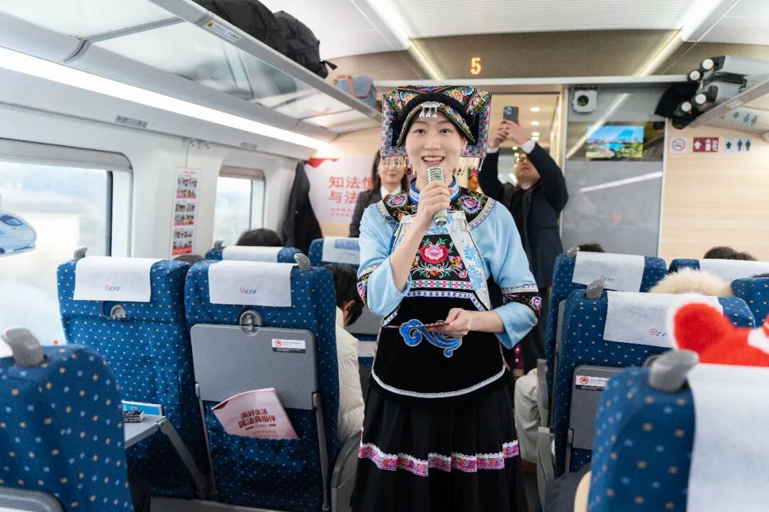 G4995次列车的5号车厢内,“法治车厢”的标识牌格外醒目。“如今的贵州,高铁成网,交通便捷,说走就走。”身着民族服饰的列车工作人员向旅客讲述起贵州交通的发展。