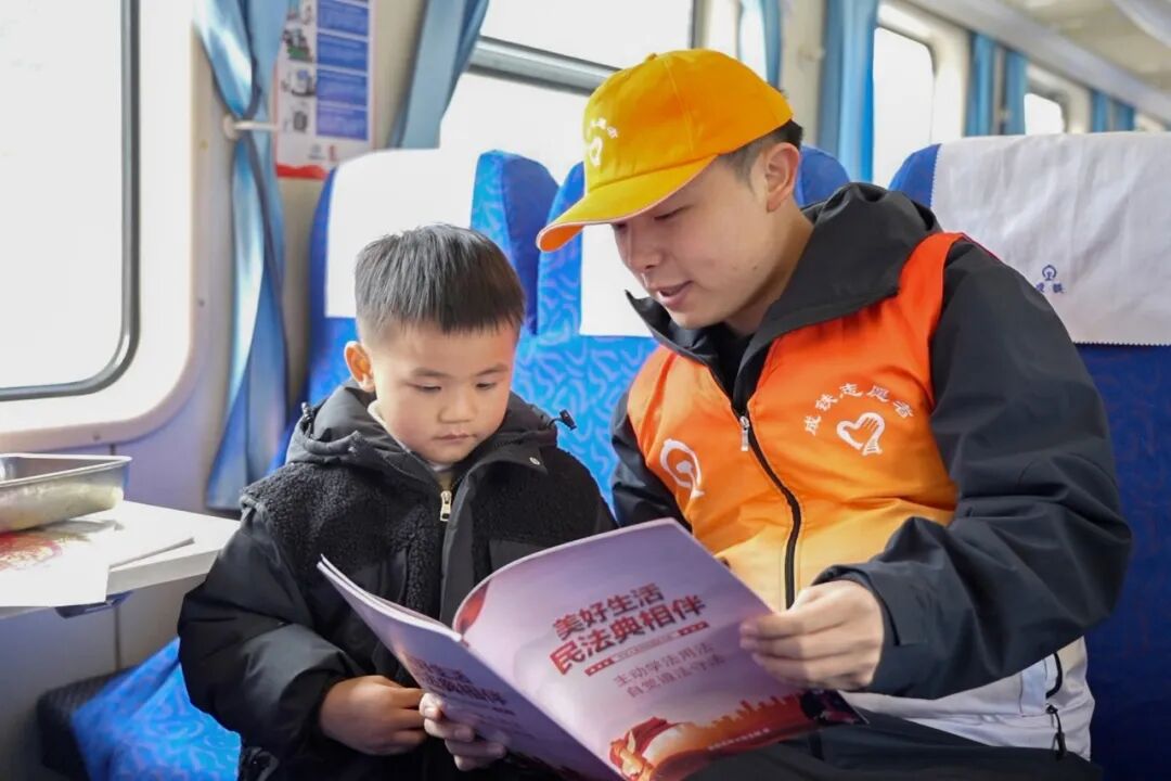 1月21日,在贵阳开往玉屏的5640次“慢火车”上,普法形式更添乡土气息。“铁路法来记心间,平安出行是关键……”苗族普法志愿者将法律条文编成歌谣,在车厢中传唱。法院工作人员与旅客围坐交流,以“拉家常”的方式提醒旅客防范诈骗,车厢内设立的“普法角”成为大家学法懂法的新窗口。