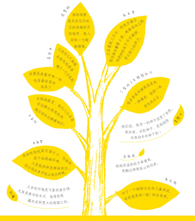 “‘妈妈’‘爸爸’是我们最早学会的词语,‘我爱妈妈’‘我爱爸爸’是我们要用一生去表达和践行的情感与行为。”文字作者朱永新这样说。作为教育学者,他选取了古今中外20多位名人回忆父母的文章,包括鲁迅、袁隆平以及他本人的成长故事,构建了全书的框架。与此同时,他采访了100位幼儿园孩子,倾听他们对父母的真实感受,这些珍贵的童言童语,为书中的父母形象注入了更多鲜活的色彩。