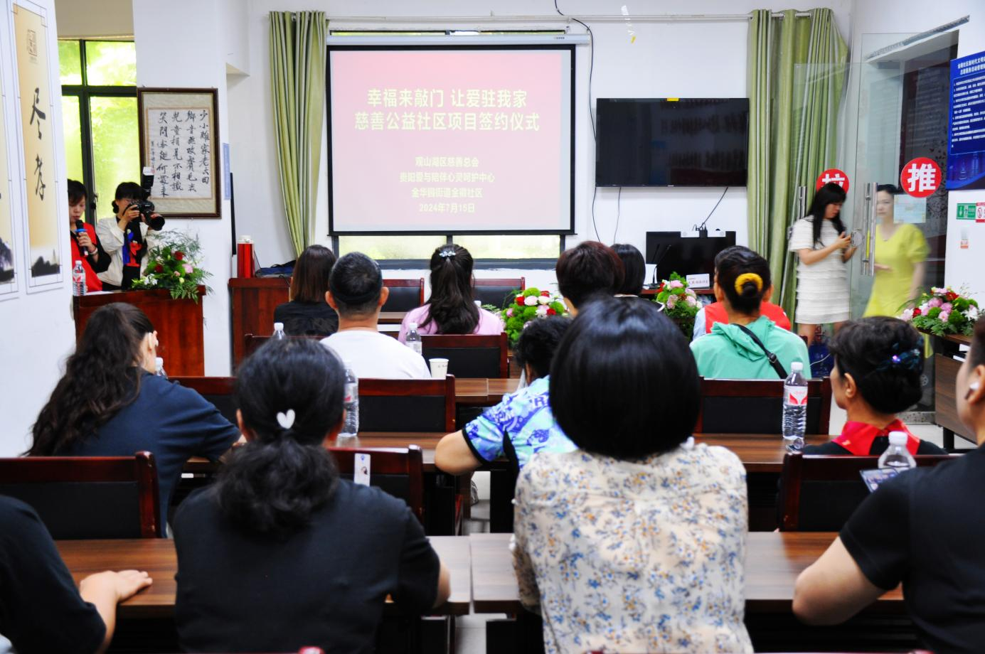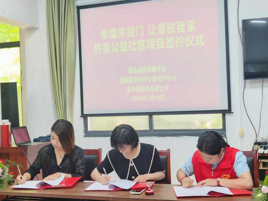 7月15日上午,贵阳市观山湖区慈善总会、金华园街道金徽社区、贵阳爱与陪伴心灵呵护中心共建慈善公益社区签约仪式在金华园街道金徽社区活动中心举行。活动本着用爱与陪伴为生命服务,托起老年人幸福晚年的服务宗旨,共建和谐慈善社区。