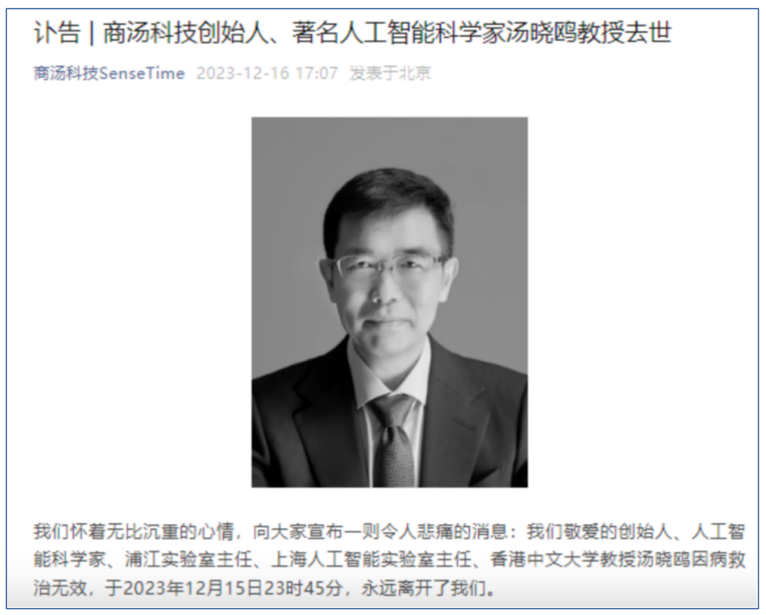 12月16日“商汤科技”微信公众号发布讣告称,商汤科技创始人、人工智能科学家汤晓鸥因病救治无效,于2023年12月15日23时45分去世。