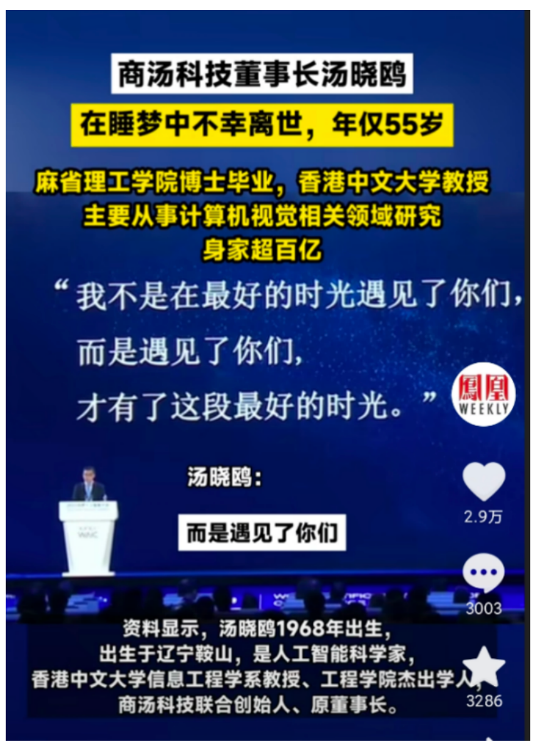 据腾讯新闻《一线》报道称,商汤科技内部人士透露,汤晓鸥是在睡梦中不幸离世。