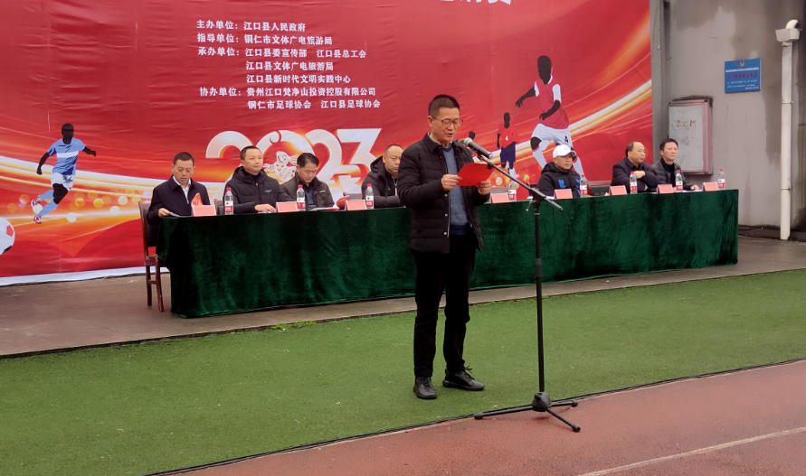 梵山净水遇知音,美丽江口欢迎您。在这生机蓬勃、播种希望的美好时节,为深入贯彻落实全民健身国家战略,大力发展以人民为中心的体育,丰富广大人民群众文化体育生活,促进各区县足球文化交流,提高全市足球运动水平,2月19日,由江口县人民政府主办,江口县委宣传部、县总工会、县文体广电旅游局承办的江口县2023年“贵州动起来”“红红火火过大年”全民健身全市足球邀请赛在县体育场举行开幕式。市文体广电旅游局党组成员龚凤军,贵州省足球协会竞赛部部长田健,铜仁市足球协会主席刘忠出席开幕式,县人大常委会副主任、县总工会主席吴帮华致辞。