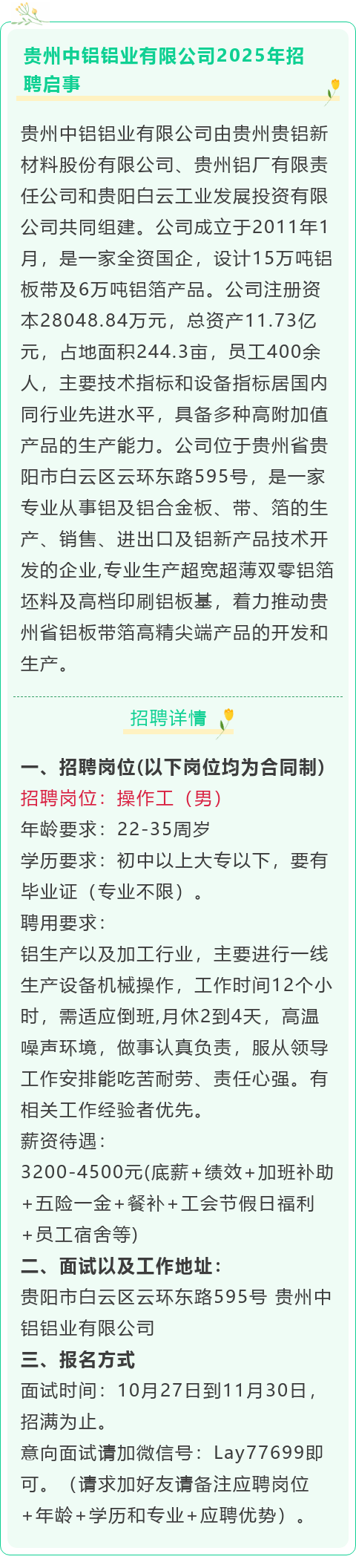 【国企】贵州中铝铝业有限公司招聘操作工!五险一金+餐补+员工宿舍等!