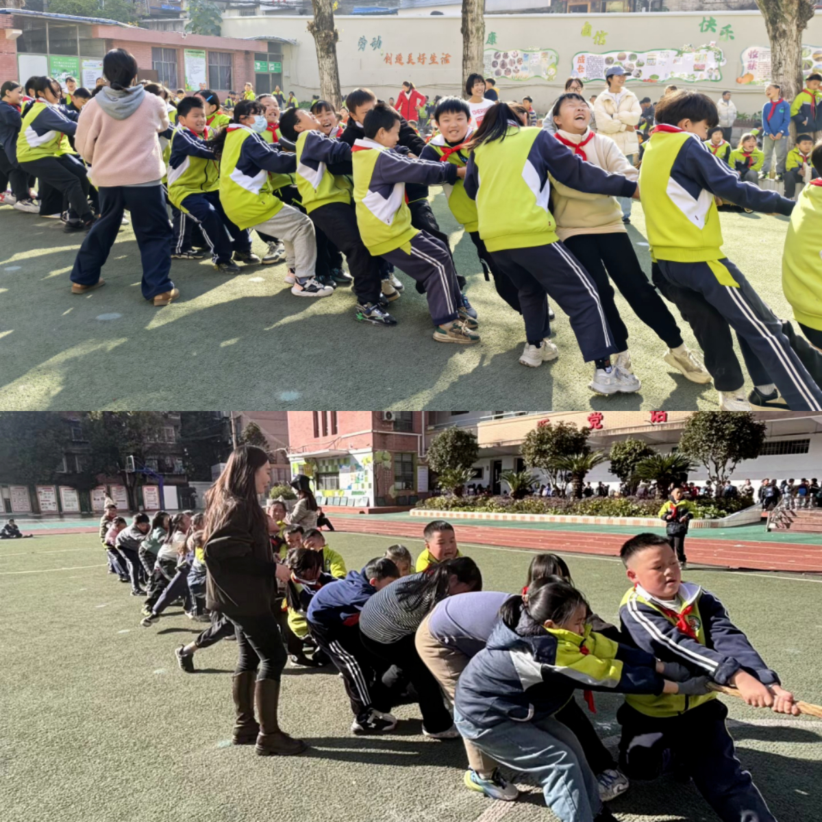 拔河比赛无疑是全场的高潮!各班级代表队一字排开,队员们紧握长绳,身体后倾、脚蹬地面,眼神坚定而执着。随着裁判一声哨响,双方队员齐心协力往后拉,红色的标记绳在中间线上来回拉锯。场边的啦啦队员们更是热情高涨,挥舞着小彩旗、喊着整齐的口号:“加油!加油!坚持住!”震天的呐喊声差点掀翻操场,连老师们也忍不住加入加油队伍,赛场内外汇成一片欢乐的海洋。