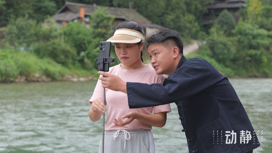 榕江县小丹江苗寨,返乡青年吴昌瑞和金玉冰直播推介村里的旅游资源
