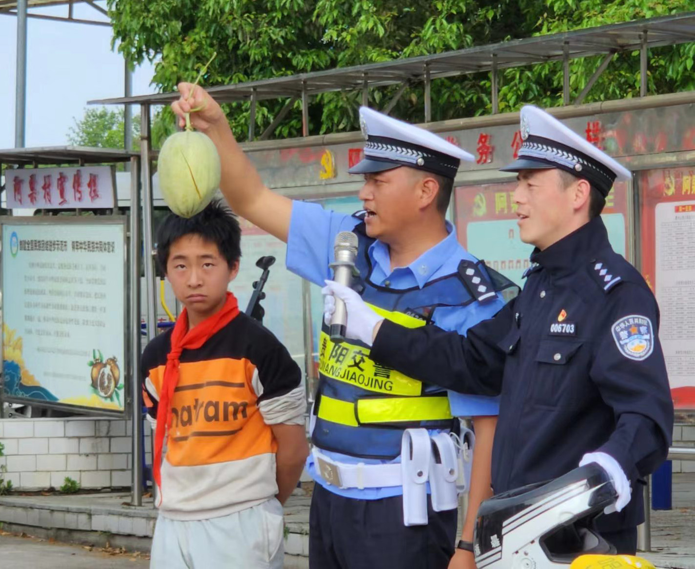 在互动宣讲环节中,乌当交管分局民警张刚与张福东就“一盔一带”内容进行互动性试验,将哈密瓜在有安全骑行头盔的保护与无保护状态下请学生参与者亲自动手感受其落地区别,以直观的视觉体验将安全意识牢记在心,并在现场请各群体代表进行安全骑行头盔的佩戴学习,使大家充分了解安全骑行头盔的正确佩戴步骤。