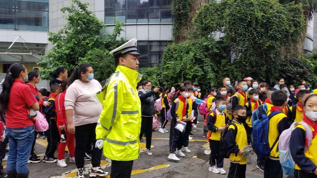 为做好返校护学工作,确保校园周边的道路安全、通畅、有序,学生快速、平安返校,志愿者、公安交警暖心护航。