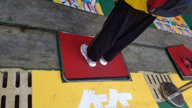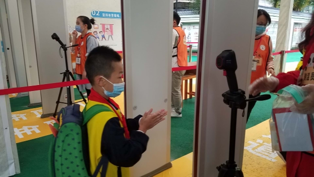 在校门口,同学们间隔一米距离,经过鞋子消毒、手部消毒、红外线体温检测、安检后有序进入校园。