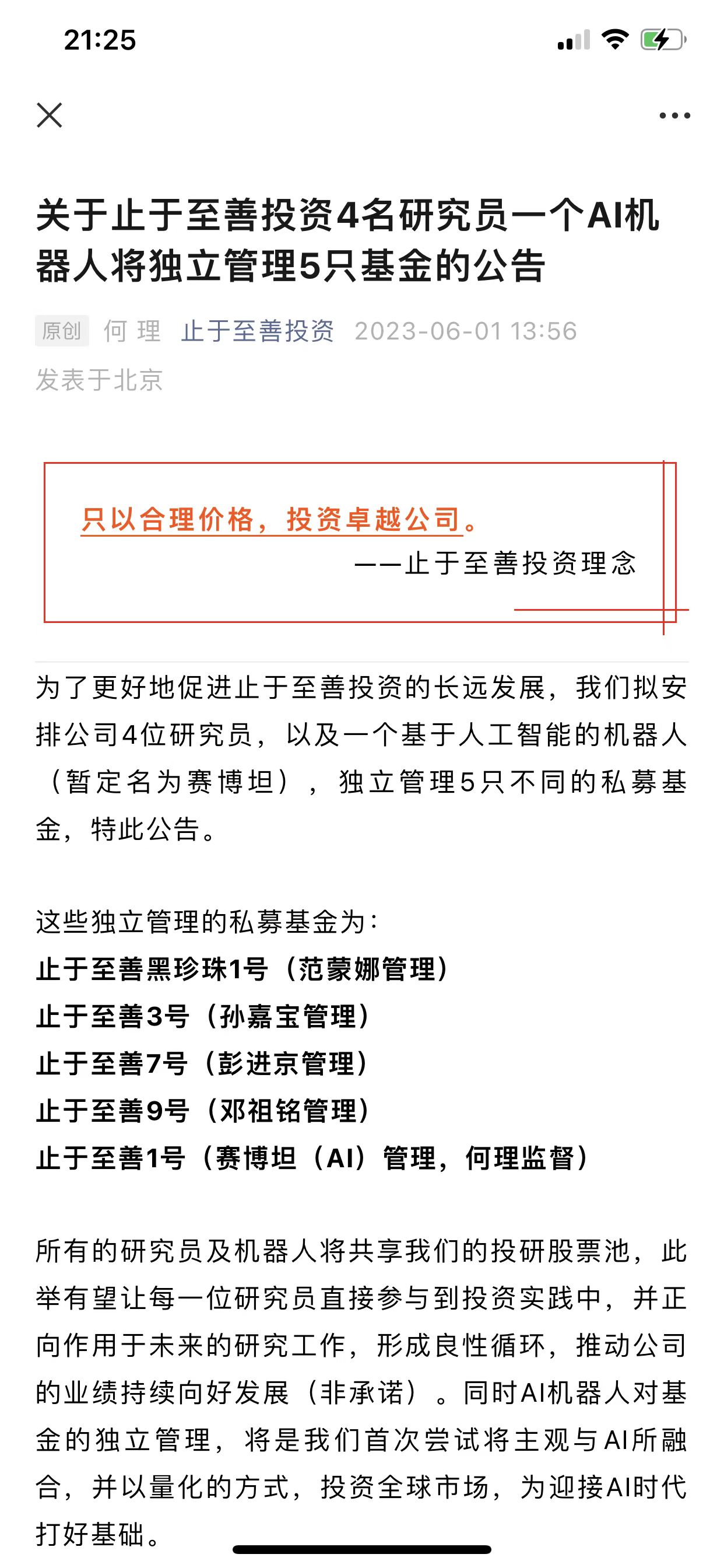 “所有的研究员及机器人将共享我们的投研股票池,此举有望让每一位研究员直接参与到投资实践中,并正向作用于未来的研究工作,形成良性循环,推动公司的业绩持续向好发展(非承诺)。”止于至善投资在公告中表示。