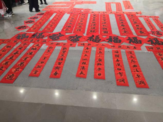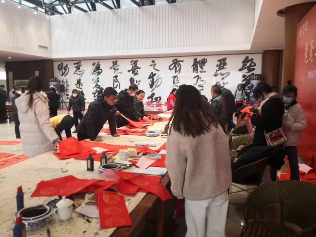 在现场,书法家李劲松的书法采用行、楷书体,书写了“丽景阳春逢盛世,宏图伟业启征程”的春联;梁兴福书法家采用隶书书体,为群众送上福字,并寄予新年将至的美好祝愿。
