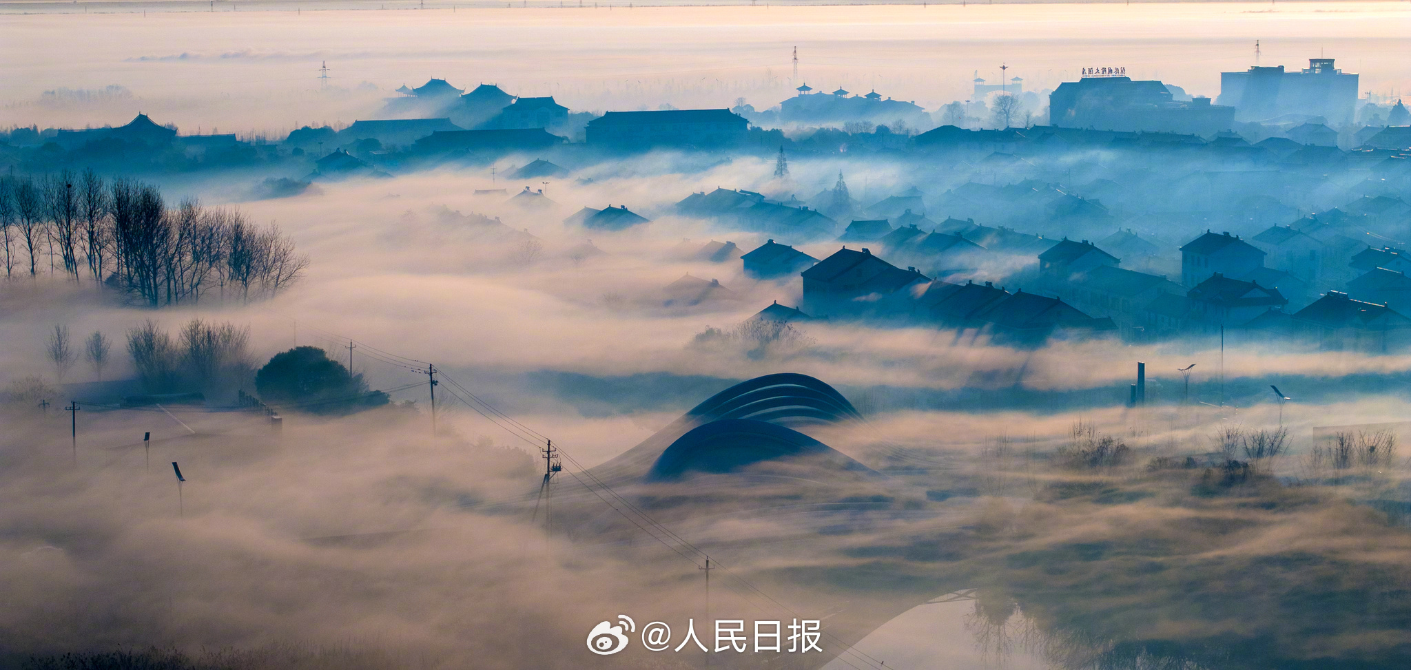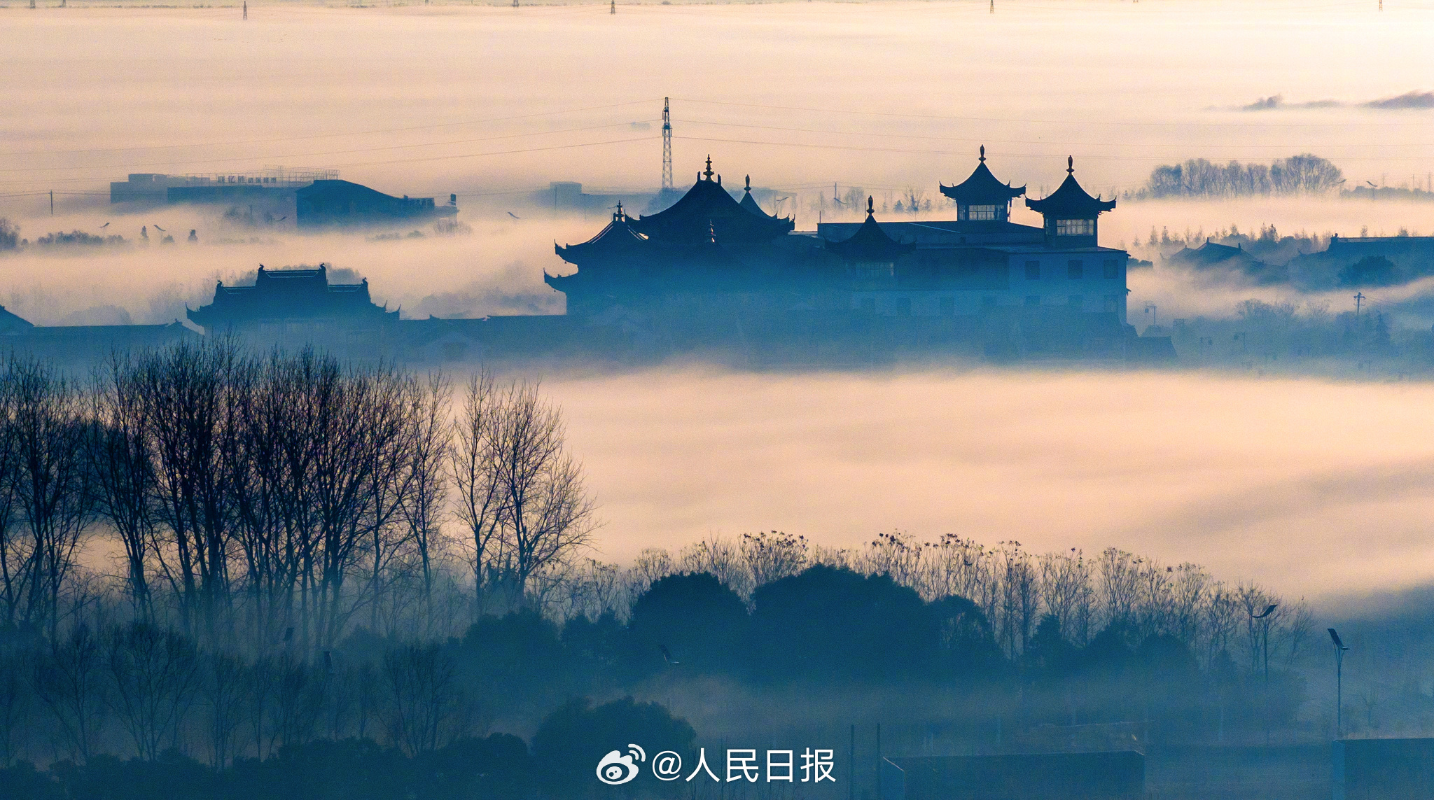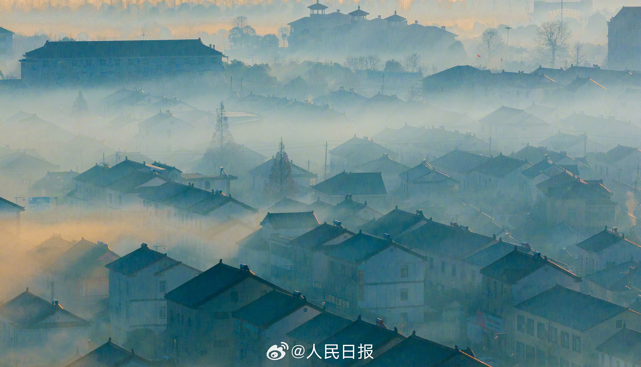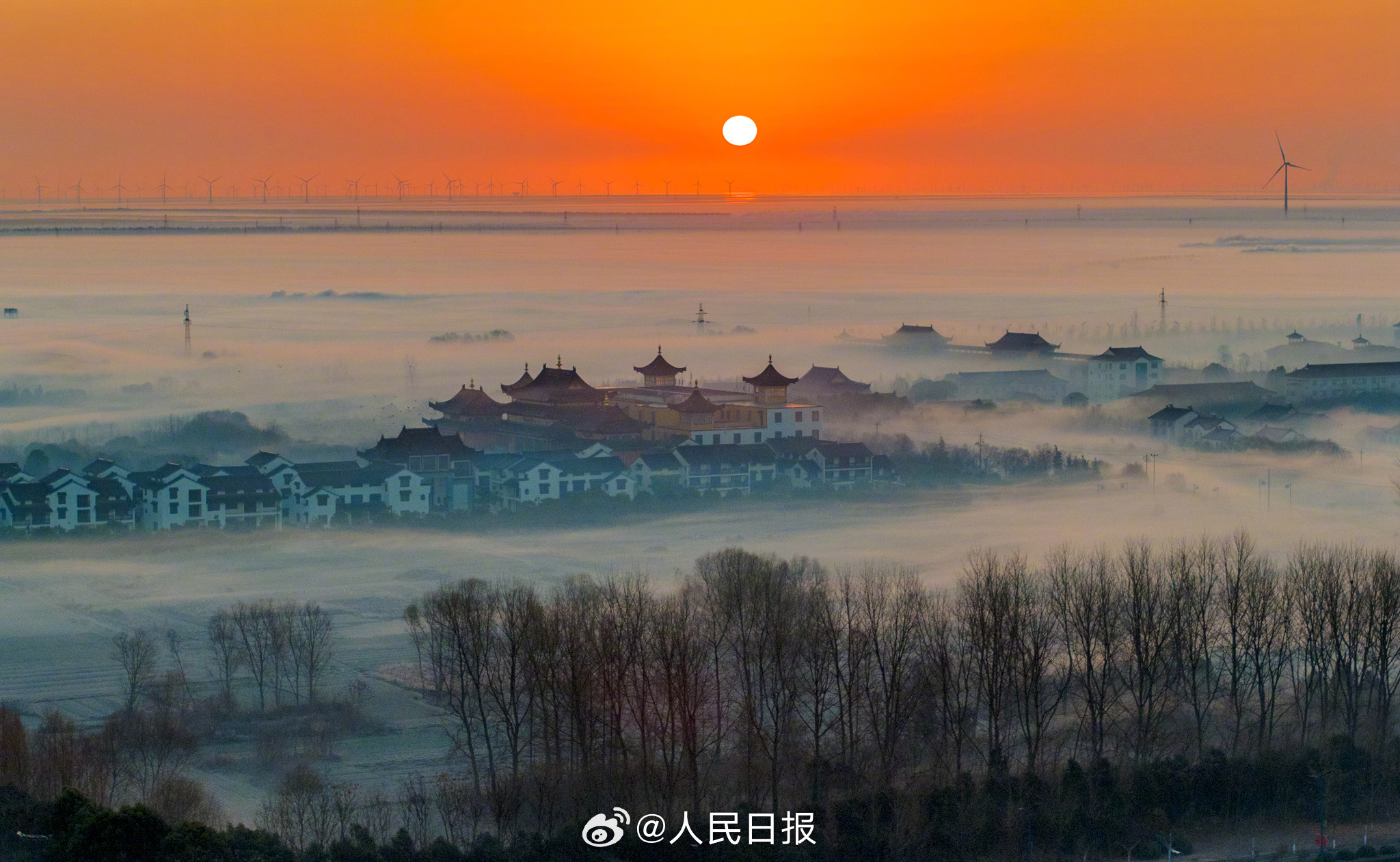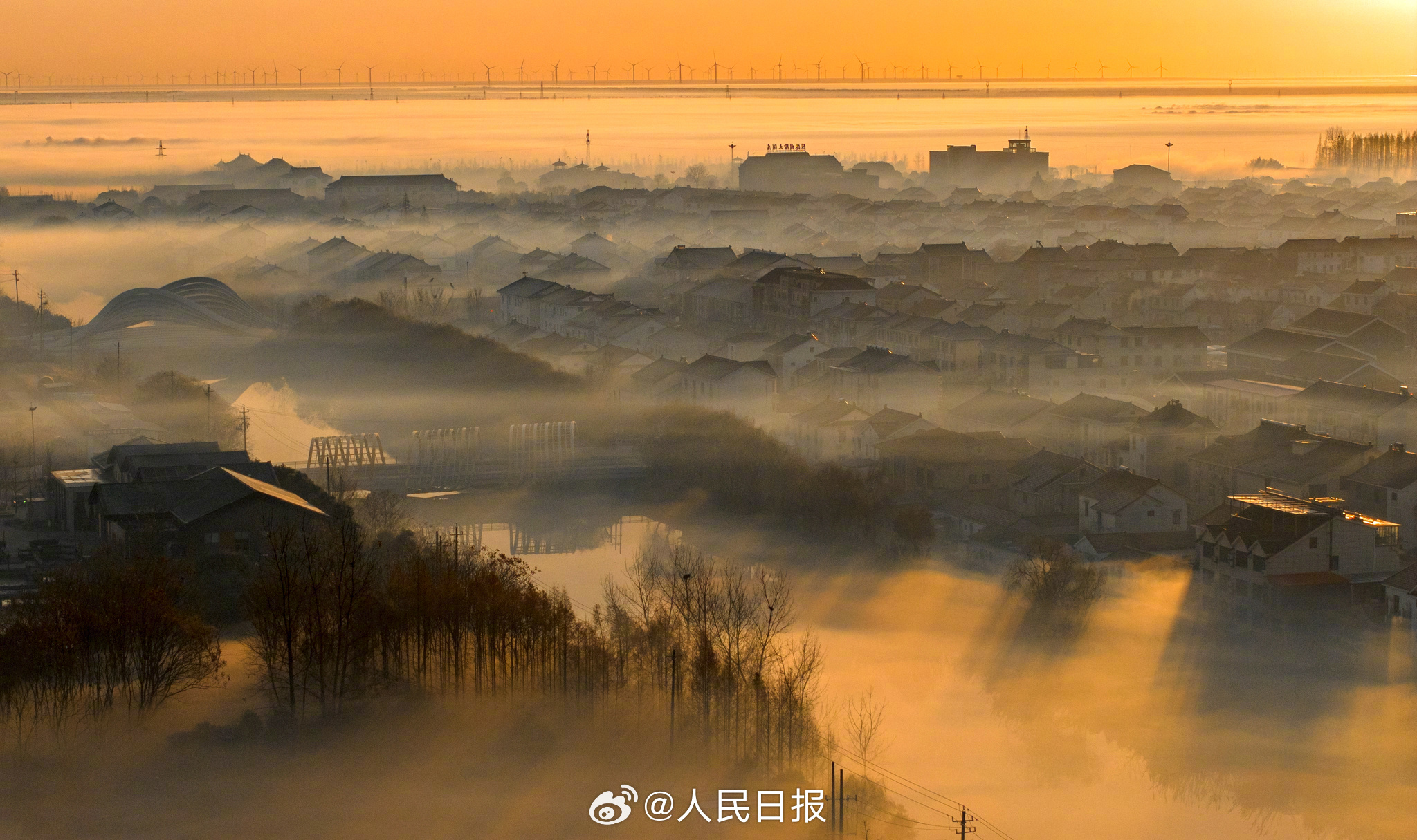1月2日,江苏东台沿海弶港镇,错落有致的街区、民居在缥缈的雾气笼罩下,若隐若现,如梦如幻,犹如一幅幅水墨画卷,美不胜收。网友:原来古人水墨画是写实派。