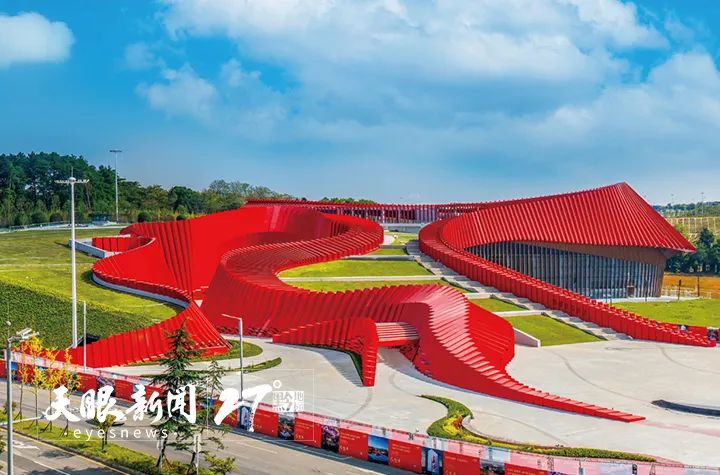 该项目由黑弓BLACKBOW担纲总创制,北京冬奥会开幕式视效总监、奥林匹克主火炬总设计师王志鸥担任“红飘带”总导演、总设计。在建筑理念上,以“地球的红飘带”为建筑核心语言,建筑形体设计以“中央红军长征路线图”作为主题,打造了南北方向蜿蜒的“红飘带”曲面幕墙的曲率跌宕起伏,形成了连续转折的动态轮廓,体现了“红飘带”的灵动之美。“红飘带”外立面色彩系统采用跳色设计,灵感来自于贵州省境内赤水丹霞,实现了建筑与自然景观的有机结合,随着观众行进视角的不断变化,可展现出不同的视觉及空间效果。