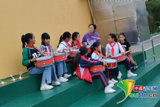 志愿者付正菀带领鼓号队的同学进行训练。四川农业大学研支团供图