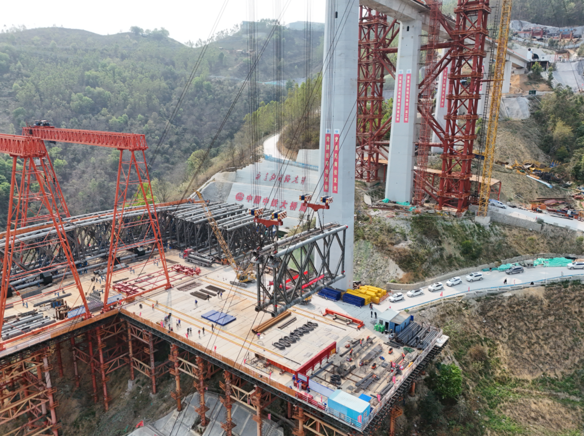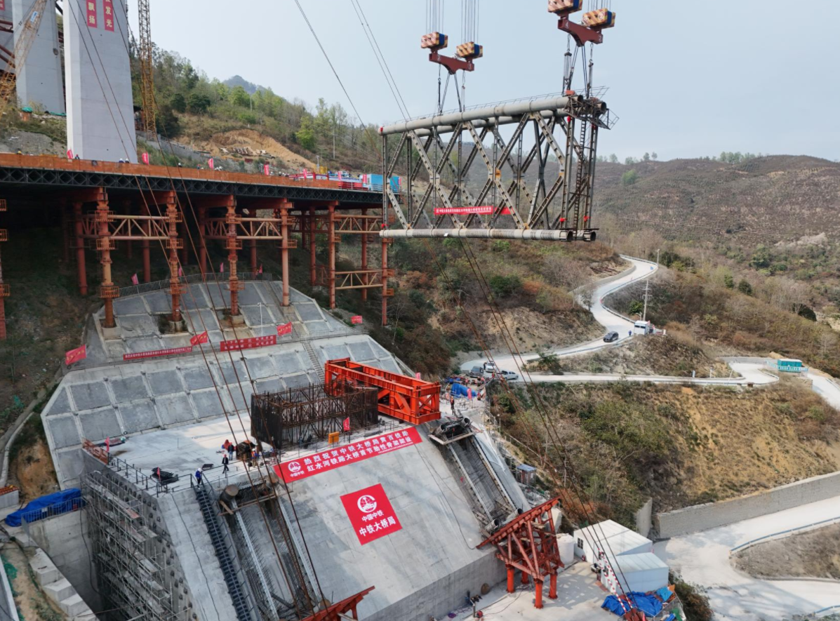 红水河铁路大桥全长约1022米,主跨跨度达570米,大桥建成后将成为世界第一大跨度铁路专用上承式钢筋混凝土拱桥。此次吊装的拱肋首节段长约25.8米、宽3.8米、高11.3米,单体重约135吨。这一庞大构件需在高空深谷间完成“穿针引线”般的精准就位,对施工技术提出了极高要求。由于桥址地处峡谷,地形陡峭,且施工需跨越红水河,建设者面临物料运输困难、高空作业风险大、环保要求高、节段重量大等多重挑战。