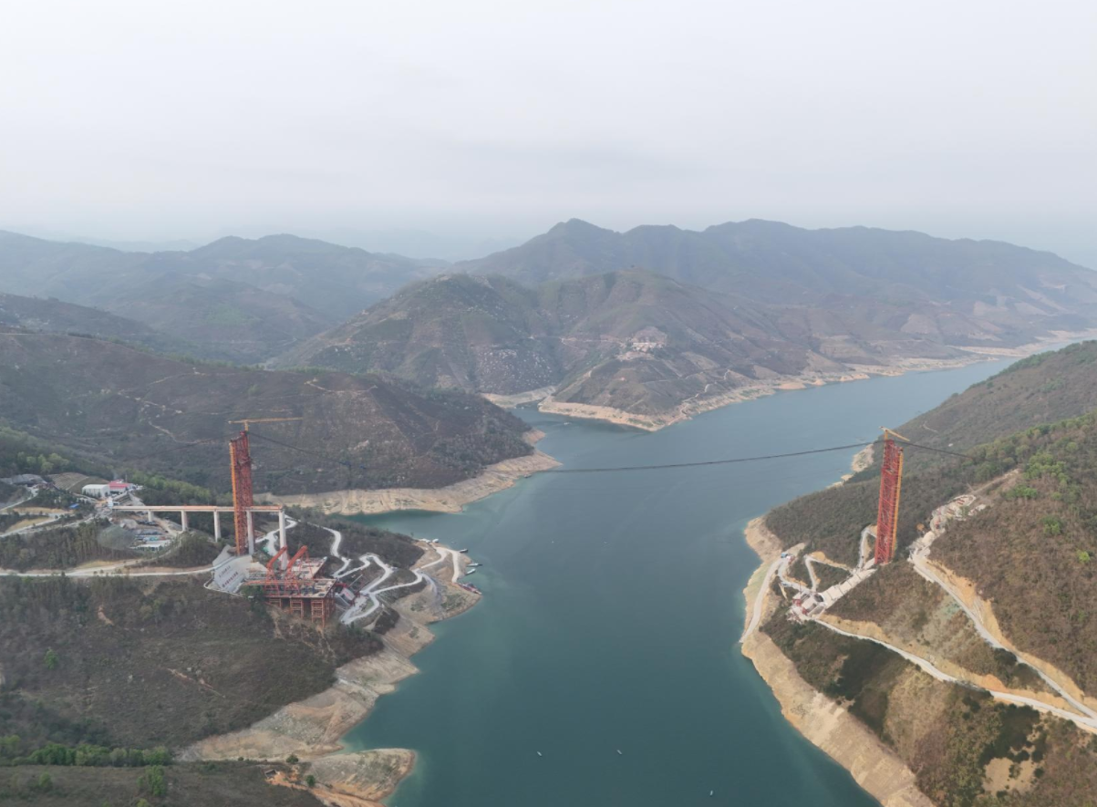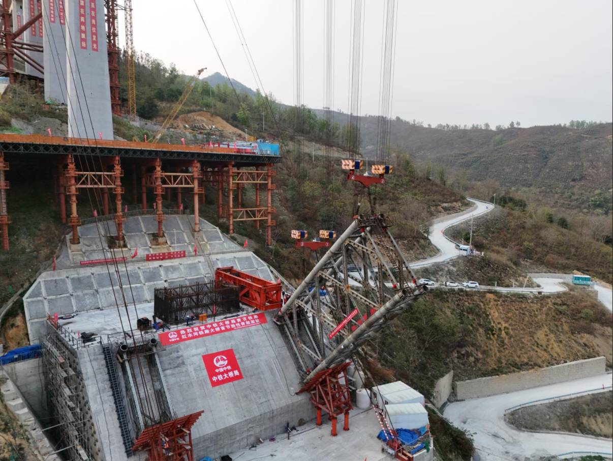 据了解,红水河铁路大桥拱肋施工采用了大型缆索吊机系统进行吊装。这套系统如同在峡谷间架起一座“空中走廊”,利用两岸锚碇固定,通过多束主缆实现“陆上起吊、空中运输、精准对接”。为攻克吊装难题,施工团队搭建了缆索吊装BIM模型,融入大桥整体模型场景,实现监测数据实时接入,通过数字孪生技术开展可视化展示与虚拟建造,将现场监测数据与BIM模型实时映射,以直观方式呈现缆索吊运行状态、风速风向、塔偏监测、钢桁拱吊装姿态、关键杆件应力、锚固力、锚碇位移等多项施工参数,实现吊装全过程全方位可视化管控。