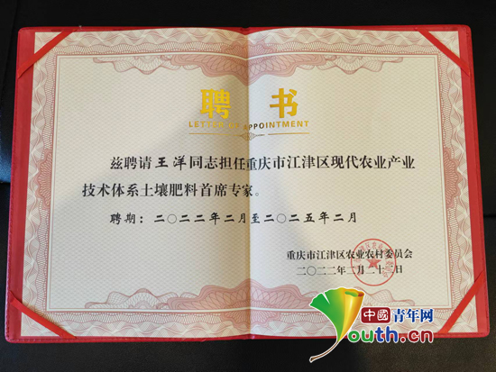 2022年,王洋被聘请担任江津区现代农业产业技术体系土壤肥料首席专家。