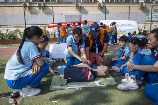 邯郸市红十字中安防减灾服务中心志愿者教孩子们AED除颤仪的使用方法。聂长青摄