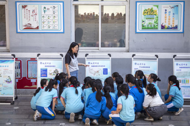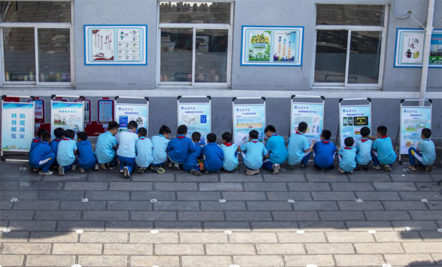 孩子们在参观地震防灾减灾知识展板。聂长青摄