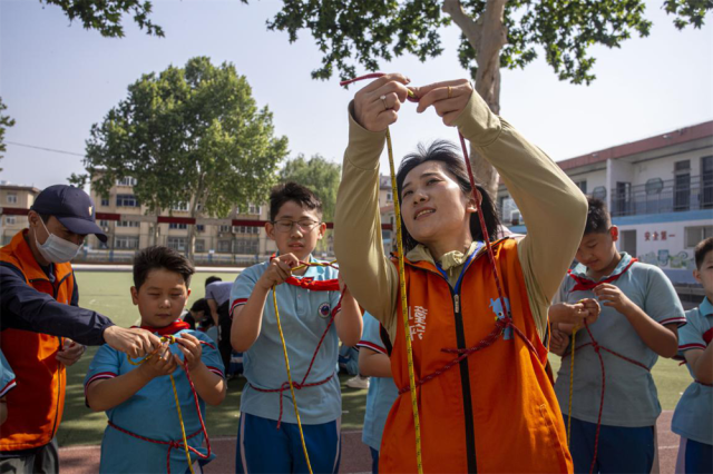 邯郸市红十字中安防减灾服务中心志愿者教孩子们绳结大比拼。聂长青摄