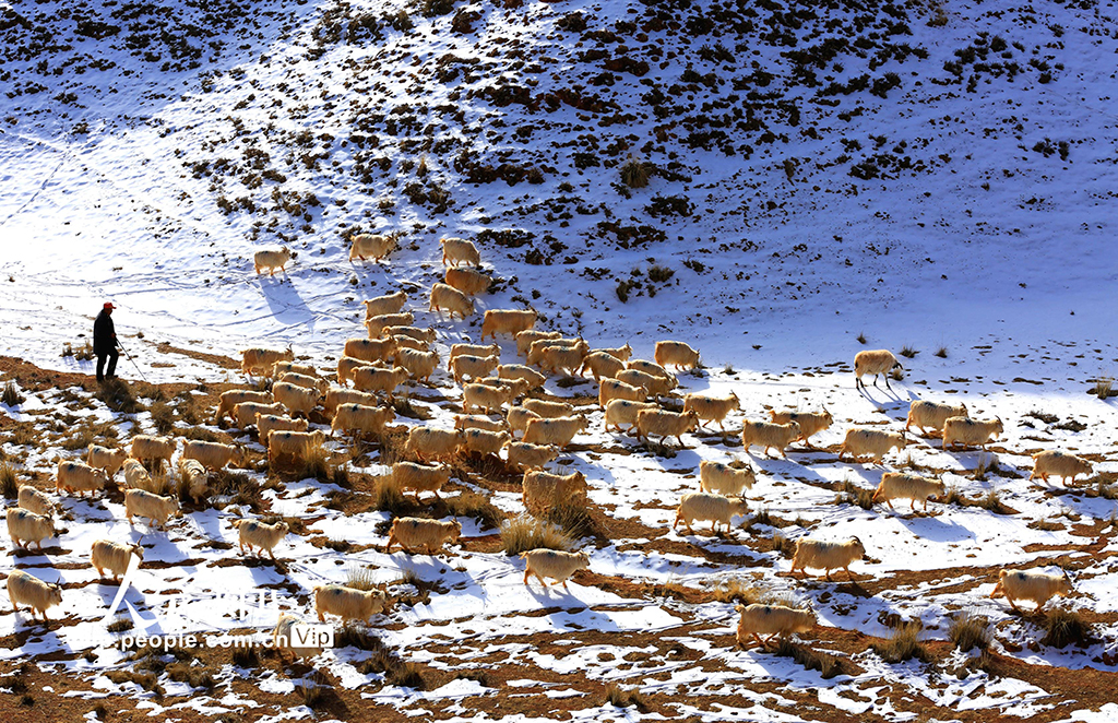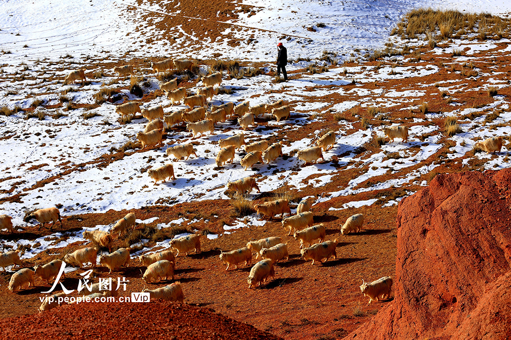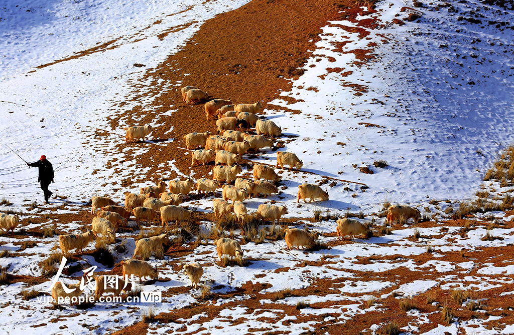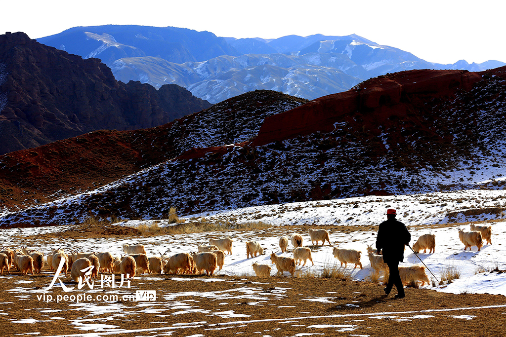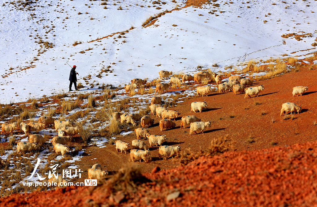 2023年1月31日,白雪皑皑的甘肃省张掖市甘州区平山湖蒙古族乡的广袤草原上,牧人正悠闲牧放着羊群。杨永伟摄(人民图片网)