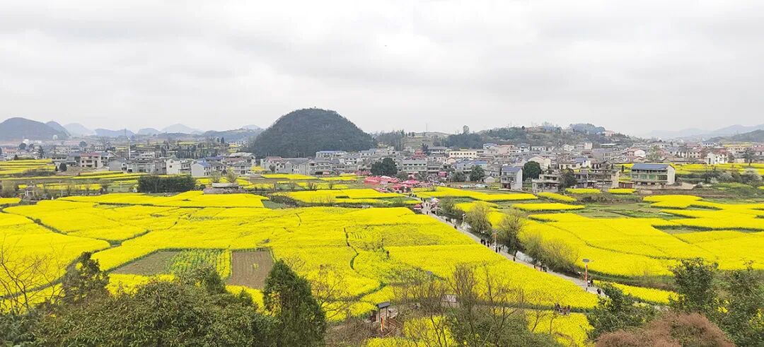 站在西秀区鲍家屯村的观景台上放眼望去,千亩油菜花铺成金色海洋,与黛青的屯堡石头房、碧绿的大坝河水交织成一幅春日长卷。